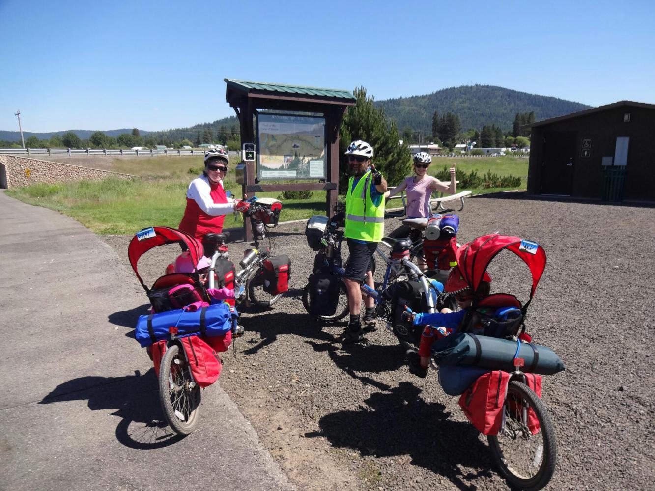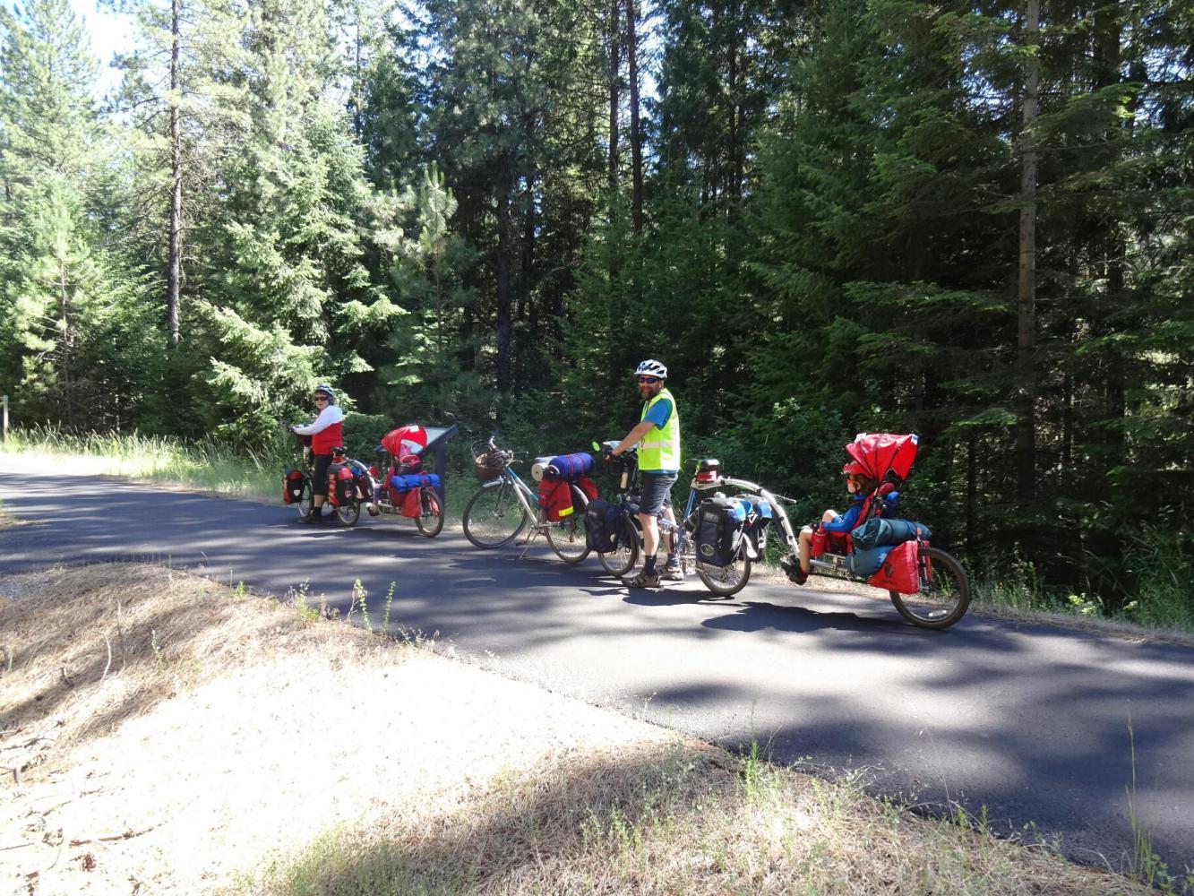 Not only is the trail paved and smooth as glass, but it is all downhill for the first 10 km. This was a good chance for us to get used to the rigs. It was the first time that we had cycled with our gear, the kids's gear, two tents, a full load of food, the Weehoo's weight, and the kids themselves. The weight of the entire rigs is too crazy to bear thinking about.
