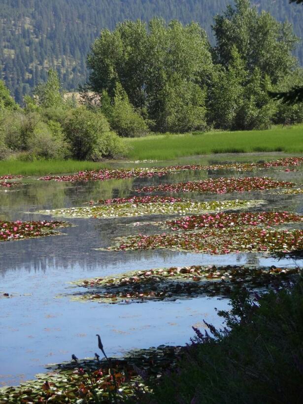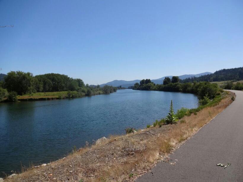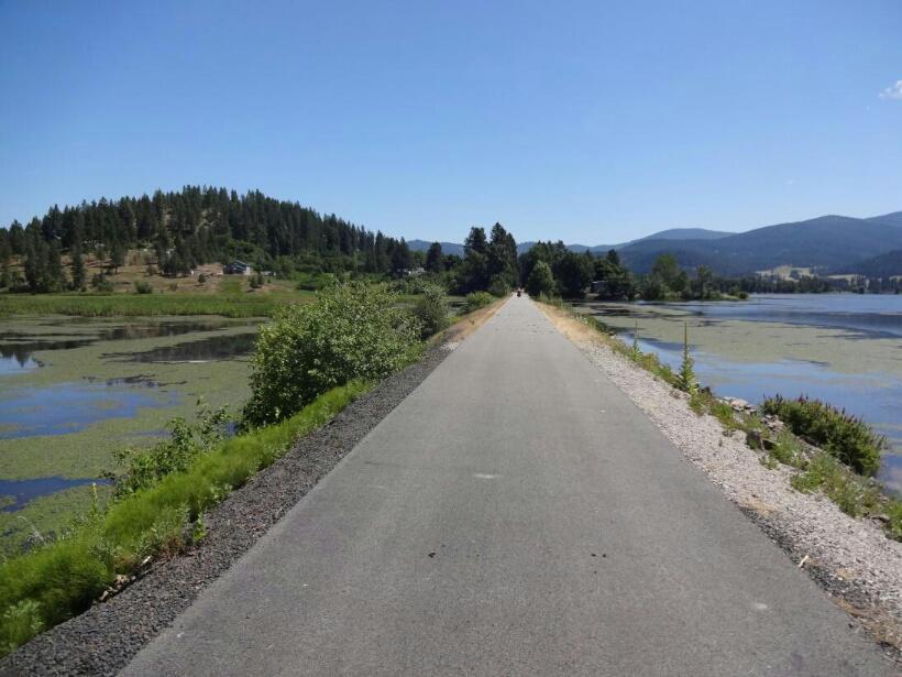 The section of the trail from Harrison toward Cataldo traverses a watery wonderland, created by the Coeur dÁlene river on one side, and a series of large ponds on the other. To call this a wonderland is not just a cliche. The trail is far from any road noise, or even habitation, making it totally silent, except for th sounds of biirds and insects. Now in summer and with the sun shining, th e flowers that line the path are bright, and fragrant.
