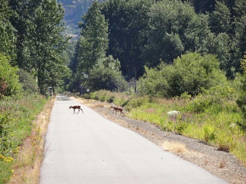 The kids handled it well, usually responding appropriately as the adults excitedly pointed out plants, animals, birds, or other features they were spotting. Of course, our weird rigs and thhe cute kids attracted lots of attention from other cyclists along the way. The kids also developed a routine for these adults. They would report that they live in Missoula but were born in Vancouver. They are almost five and their birthday is July 27., etc. Then they would hand out a business card. They shouldd go into sales, while they are still cute.