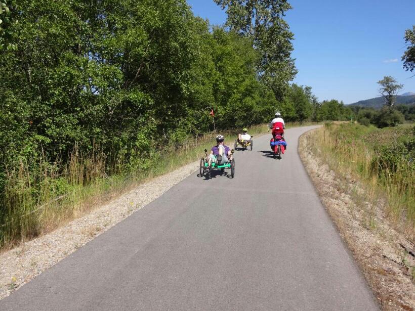 More kilometers still, and the temperature climbed to 38 degrees. We had come prepared with lots of water, but high heat is always a strain. For the adults, the flat trail meant little or no gear shifting, while the heavy load created a fair amount of drag. The experience was pretty much the same as spinning in a hot gym with the drag set just high enough to tire you out well.