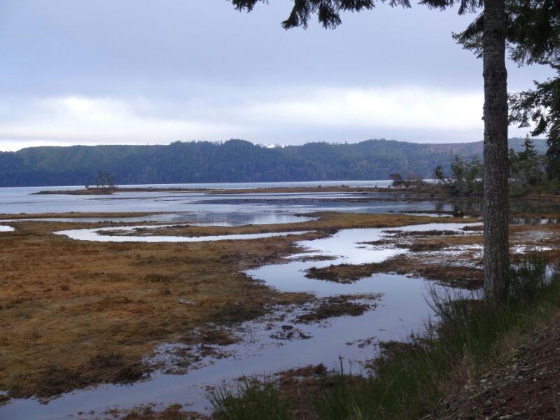 At the bottom we came to our first view of the Hood Canal. Unfortunately we also came to a really strongt and cold wind coming off the water. We had already put on our waterproof pants because of rain, but now they helped protect against wind and cold as well. The temperature was not too bad, at 3 or 4 degrees, but the wind chill effect was brutal.