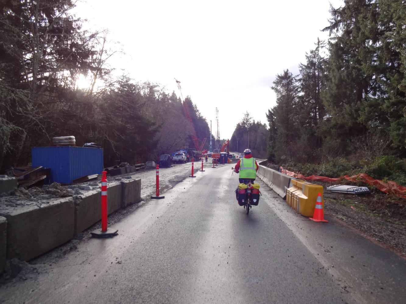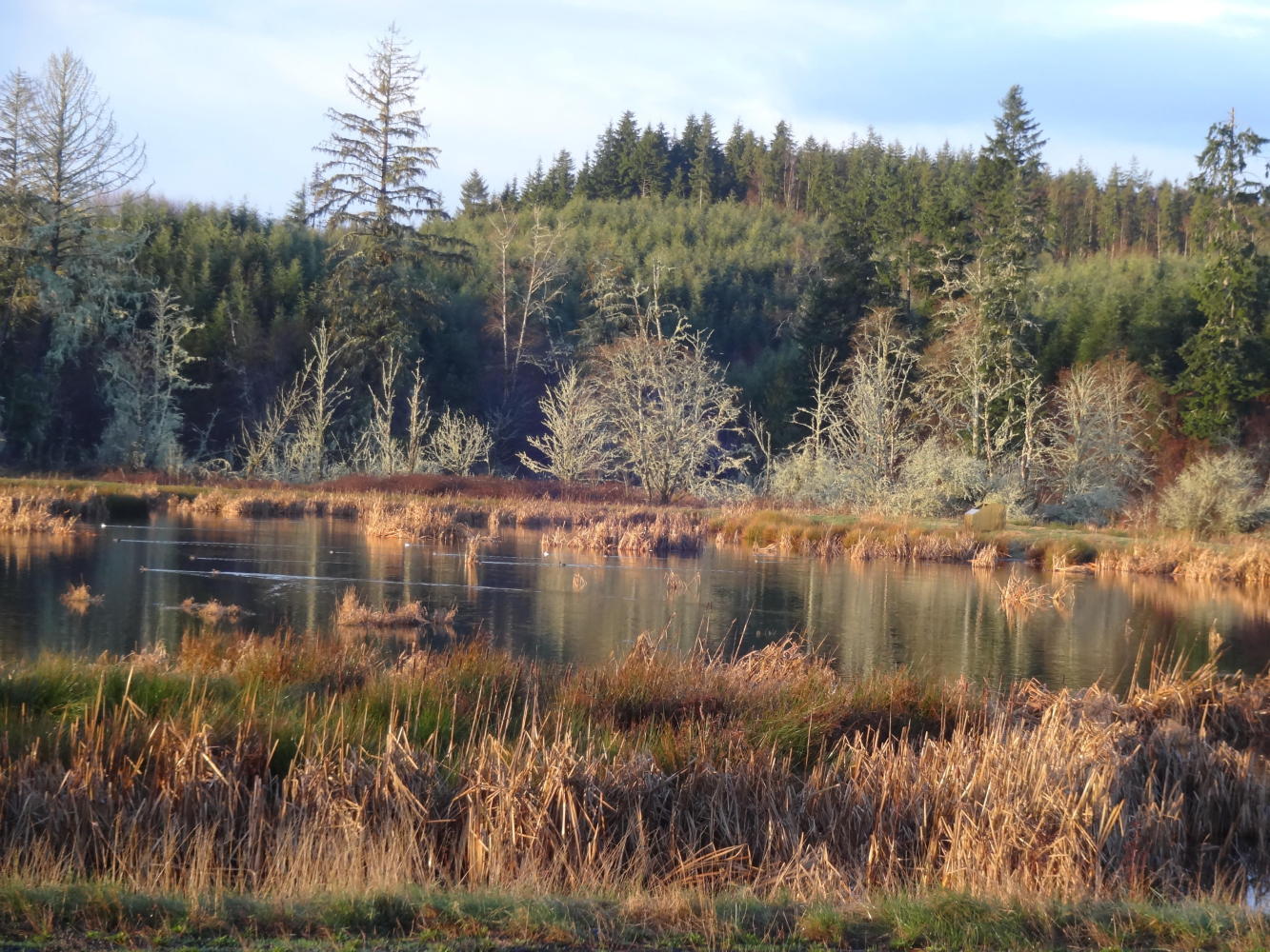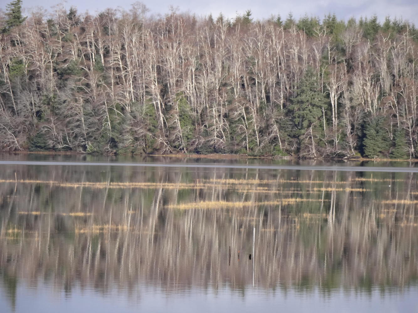 It turned out that today, at least, the finer points of damp glove management were not critical, because it basically neglected to rain. One effect of that was that we could effectively see, appreciate, and photograph the scenes on our ride beside mud flats, forest, and finally Willapa Bay, on the way down to Ilwaco. With the sun sort of out, the Winter light was interesting, and the ride became very enjoyable.