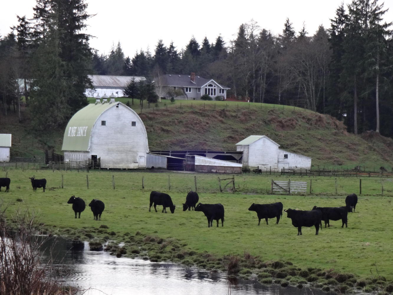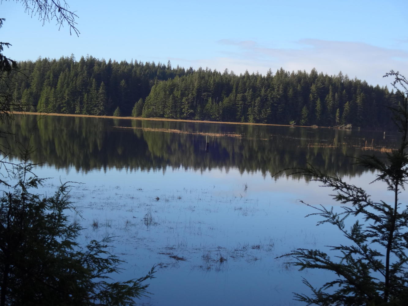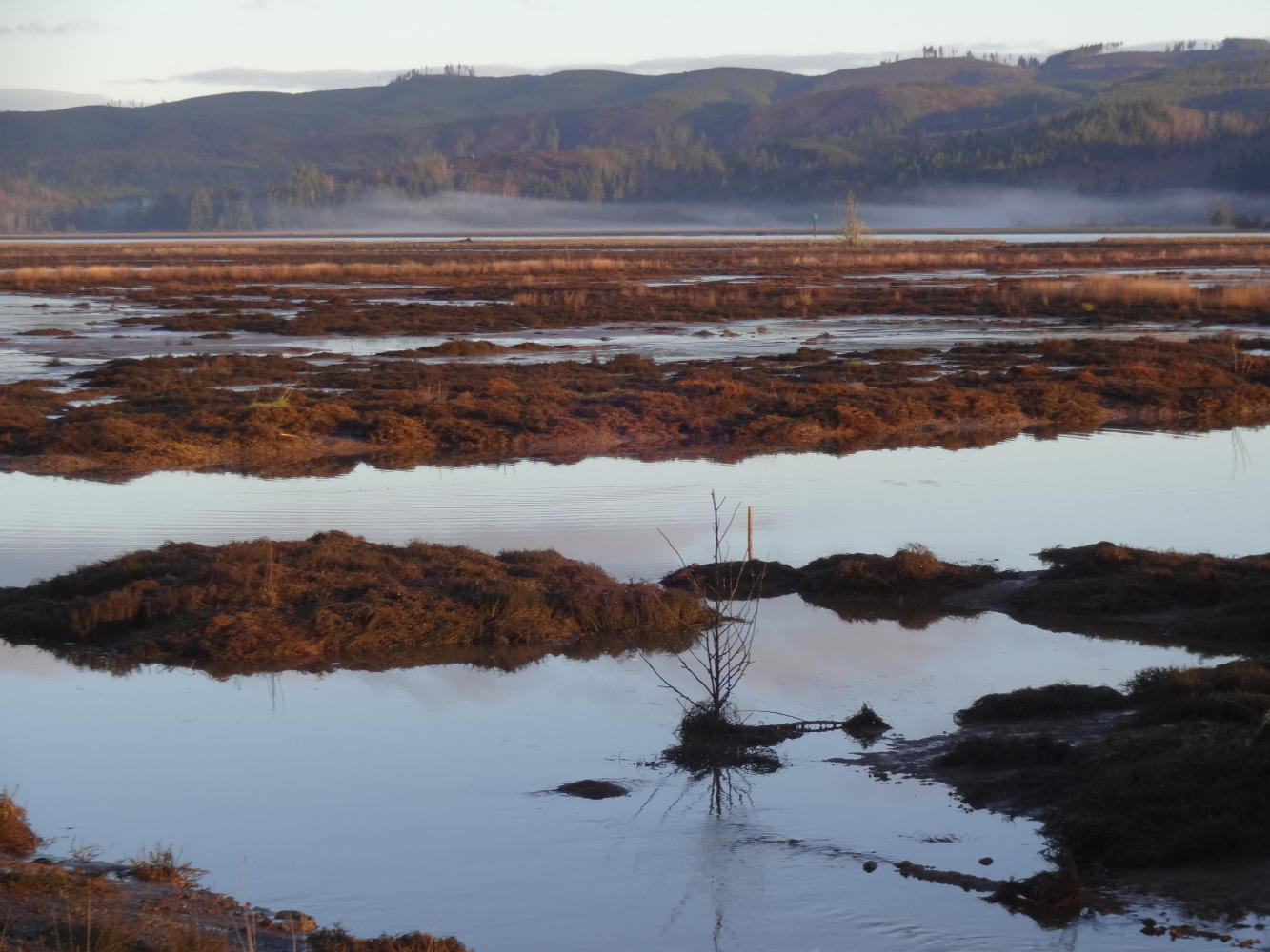 It turned out that today, at least, the finer points of damp glove management were not critical, because it basically neglected to rain. One effect of that was that we could effectively see, appreciate, and photograph the scenes on our ride beside mud flats, forest, and finally Willapa Bay, on the way down to Ilwaco. With the sun sort of out, the Winter light was interesting, and the ride became very enjoyable.