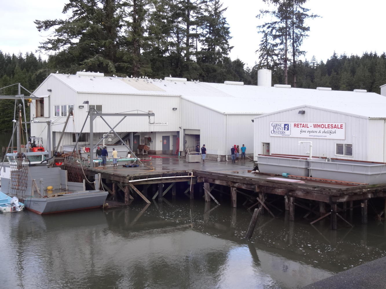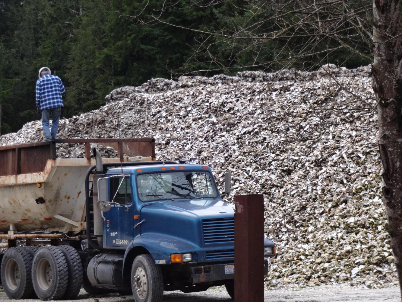 We also learned a bit more about the local economy, passing a large oyster processing plant at Niawiakum River. We noticed that the workers here spoke Spanish. Later, we also came upon a large stockpile of oyster shells, with some being loaded into trucks. Later we saw those trucks, piled high, on the highway. So, clearly, the shell bits by the roadside do not come from our tongue in cheek roadside shucking parties, but from some serious on road oyster trucking. Duh.