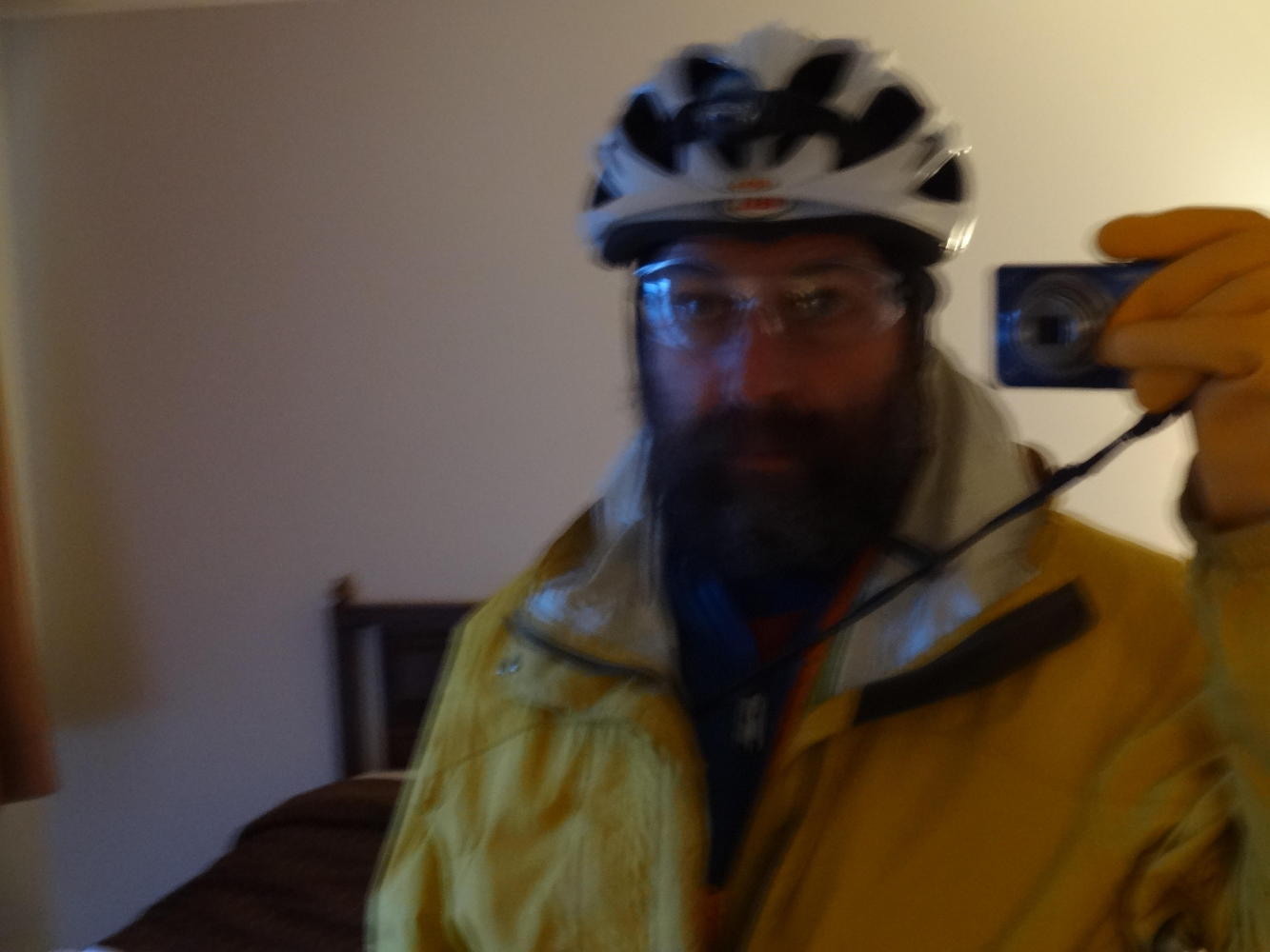 With our gloves still damp from yesterday, we broke out our Plan B supply, which means dish gloves and wool liners. Gloves may seem like a straightforward topic, but of course nothing is straightforward with us. Gloves not only need to keep the hands warm and dry, but you have to be able to take them off and put them on while riding. If you can do it when your hands and/or the gloves are dry, what happens when things are damp?