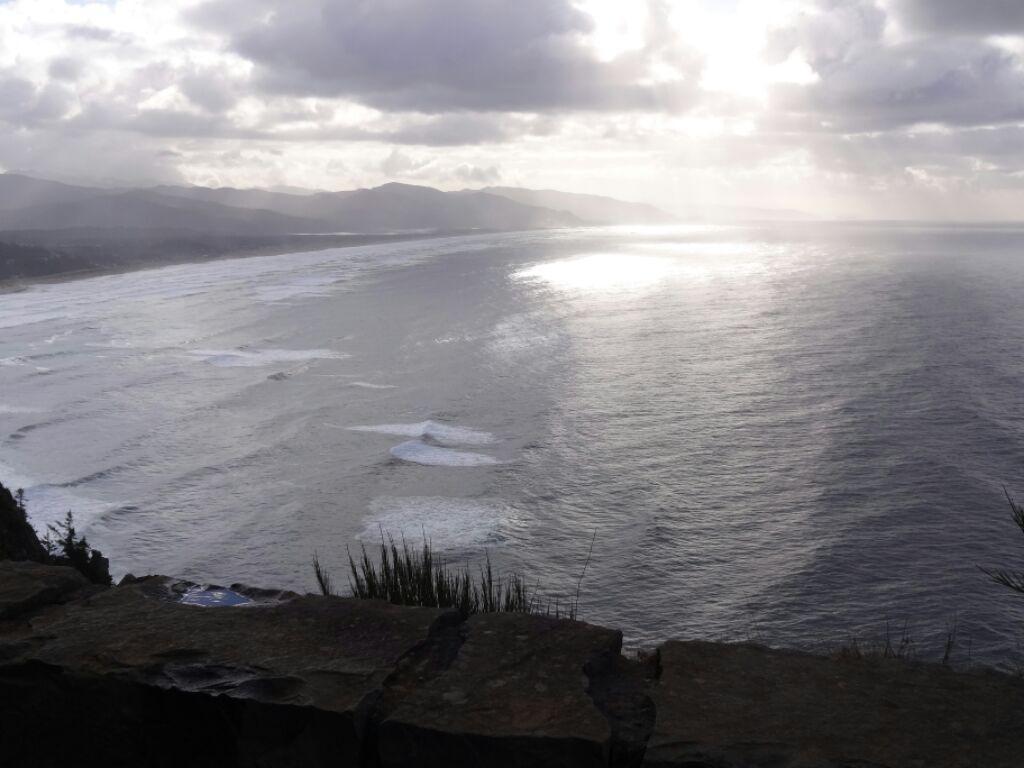 This section of road did reward us with views first of the "haystacks" out in the water south of Cannon Beach, and then of sunlight on the water, from the top of the second hill (Arch Cape).