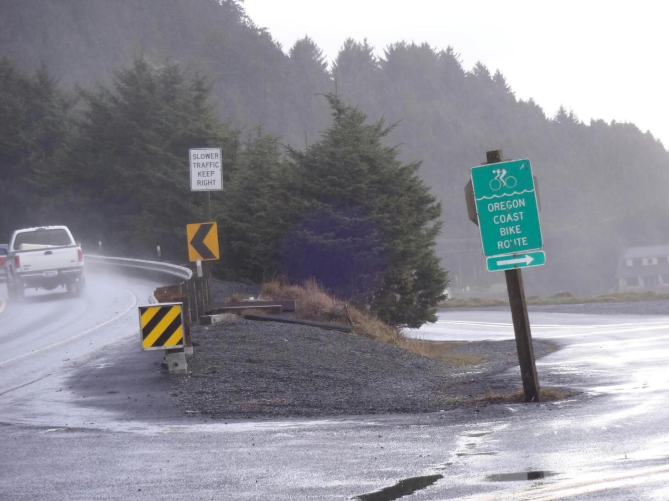 A second diversion from 101 took us mosly around Newport, which is quite large, and is a "real" town, with many streets. I took a shot of where the bypass begins, begins I wanted to illustrate a point at which the signed bike route diverges from the ACA route or the Cycling the Coast book route. As it happens, later checking showed that all sources agreed on the bypass. Oh well, the shot also illustrates the wet roads.