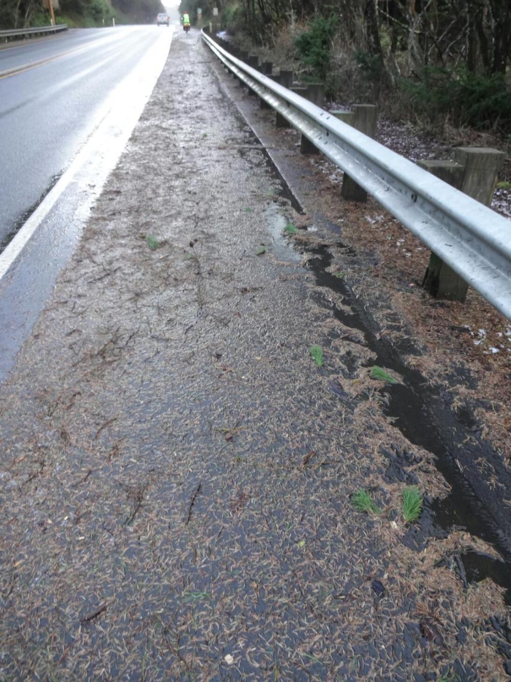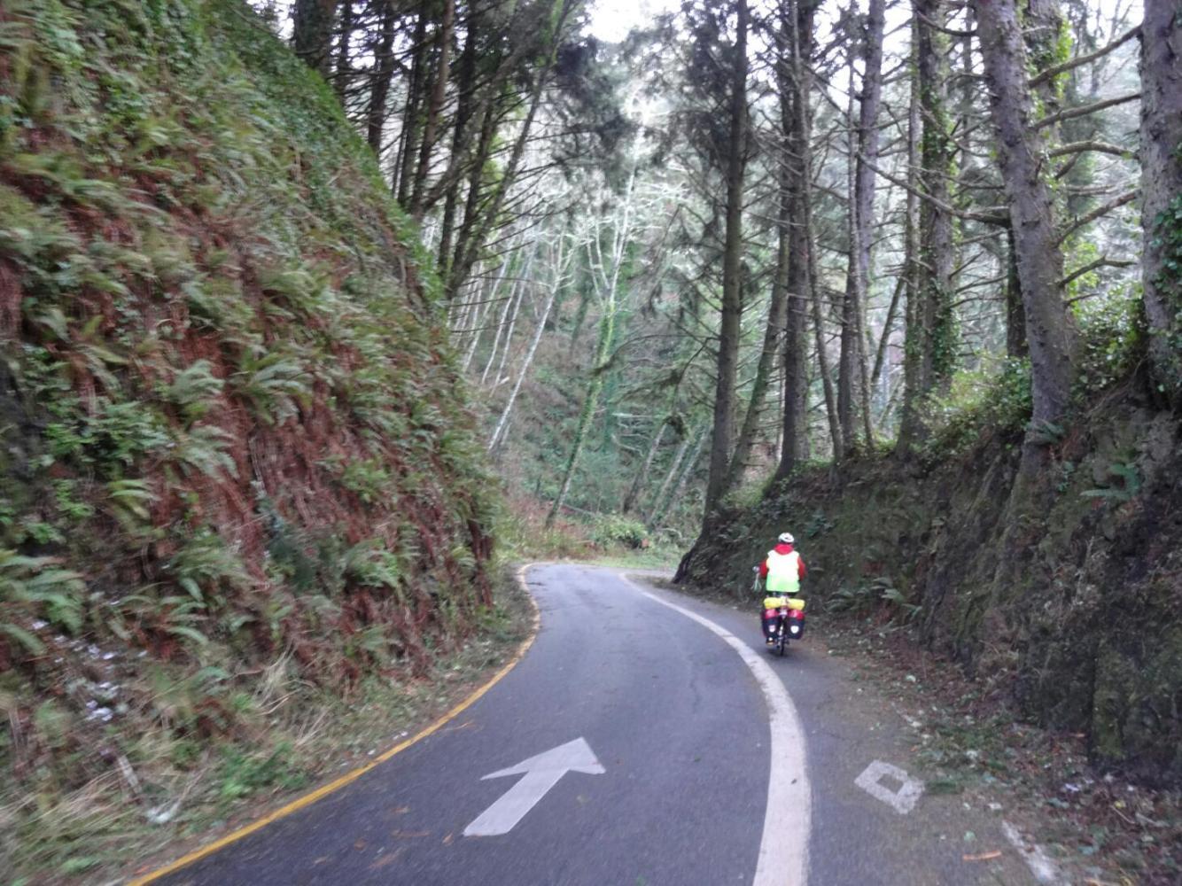 If I were to look for a challenge this day, it would be the often poor condition of the shoulder, coupled with the amount of traffic. With the traffic, and also the lingering effects of our previous falls, there really was no room at all for allowing the bikes to go skittering. Yet the shoulder was often covered with tree needles and debris from high winds. We went very very slowly, leaning on the brakes on downhills, focussing all our brainpower on staying upright. This is quite different from my usual style, which features swanning around behind Dodie, looking through the camera, drinking coffee, or daydreaming.