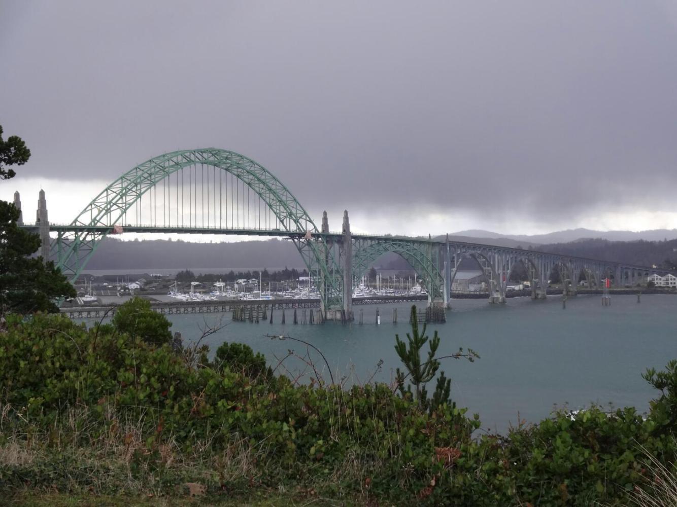 It was quite a different story at Waldport, which has a large bridge over Yaquina Bay. With the heavy traffic on the bridge, the only way to cross is on the rather narrow sidewalk. The sidewalk is naturally on the outside edge of the bridge, and hangs out over the water. This is the kind of situation that gives me the heebie jeebies: Two hundred foot drop on one side, stream of oncoming traffic on the other side, and my way a two foot channel between the two. I did it by focussing on the ground two feet straight ahead and singing to myself. Meanwhile, Dodie fearlessly charged on, way ahead. Show off!