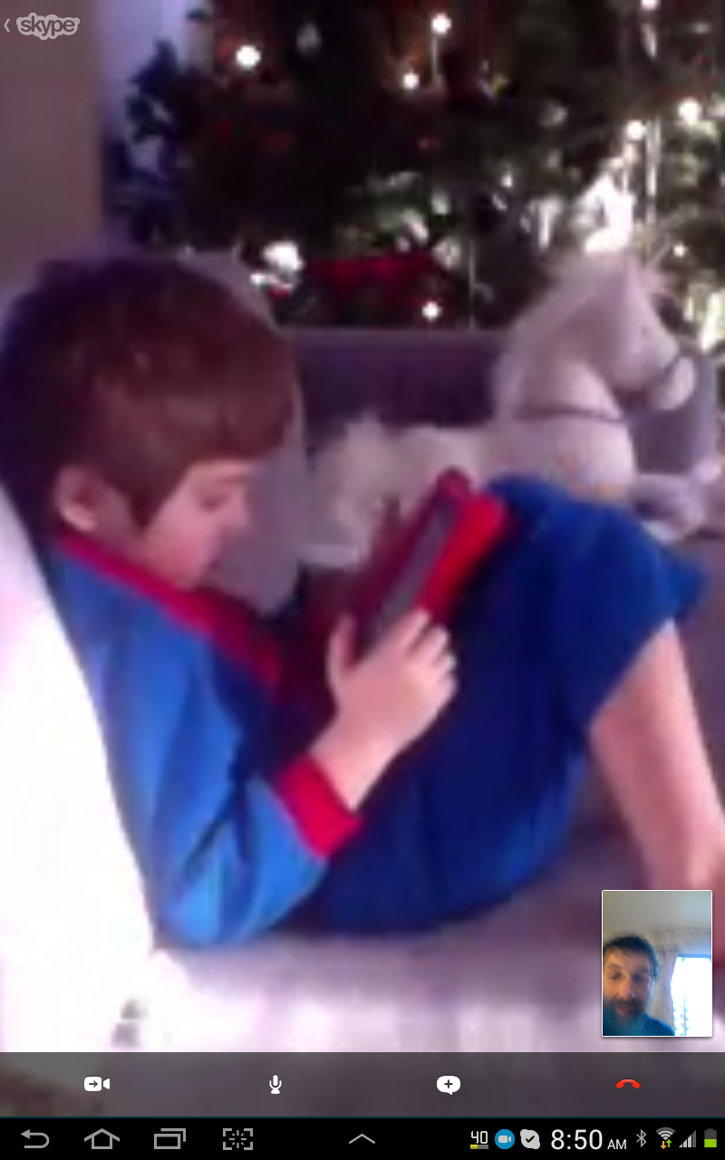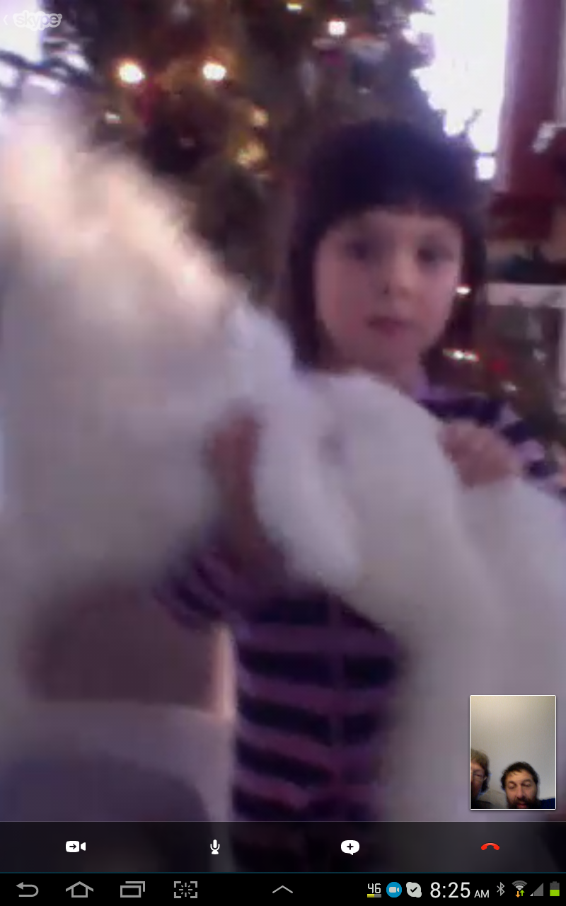 We were able to connect (more or less) with Skype to Avi and Violet and Laurie, out in Montana. It made the day feel right, to at least be with two grandchildren for a little while. Violet is entranced with her new unicorn and crawl in cardboard castle, while Avi is still fascinated by the Android tablet acquired two months ago.