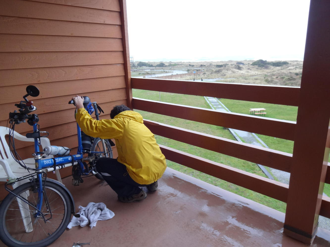We took some time for a closer look at how the bikes are faring, after almost 1000 km in the rain. Things that would be easy to fix up are more or less impossible to deal with in a motel. But, under cover just outside, we tried cleaning grunge encrusted rims, lubricating a sticky brake cable, changing some brake pads, checking tire pressure, and repairing yesterday's punctured tube. We still need more brake pads, a brake cable, and an expert opinion about deep grooves in at least one rim. There are no bike shops in this town, so any concerns will have to wait until Brookings or Crescent City perhaps.