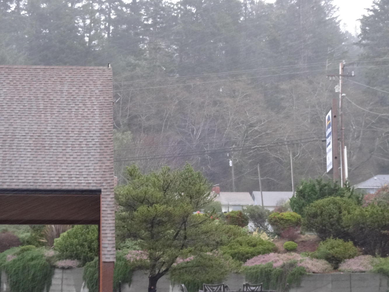 The storm arrived early this morning on schedule. It was quite remarkable to watch a river of water being driven by wind across the parking lot. We are feeling smug, of course, because we did today's cycling in the sun, yesterday.