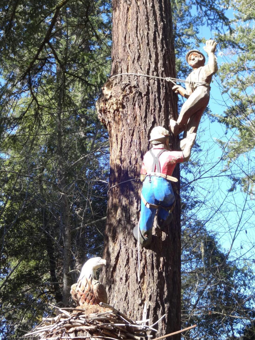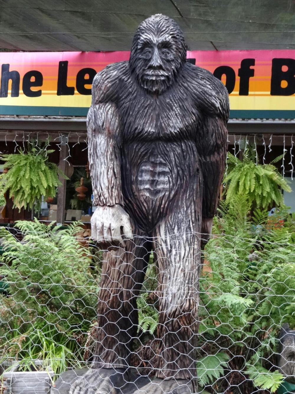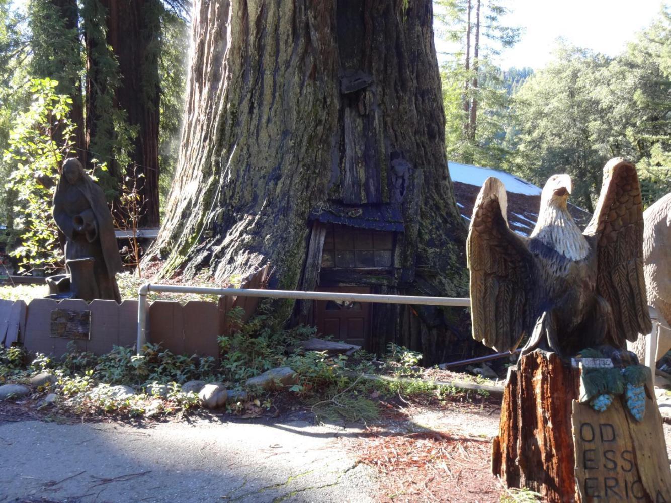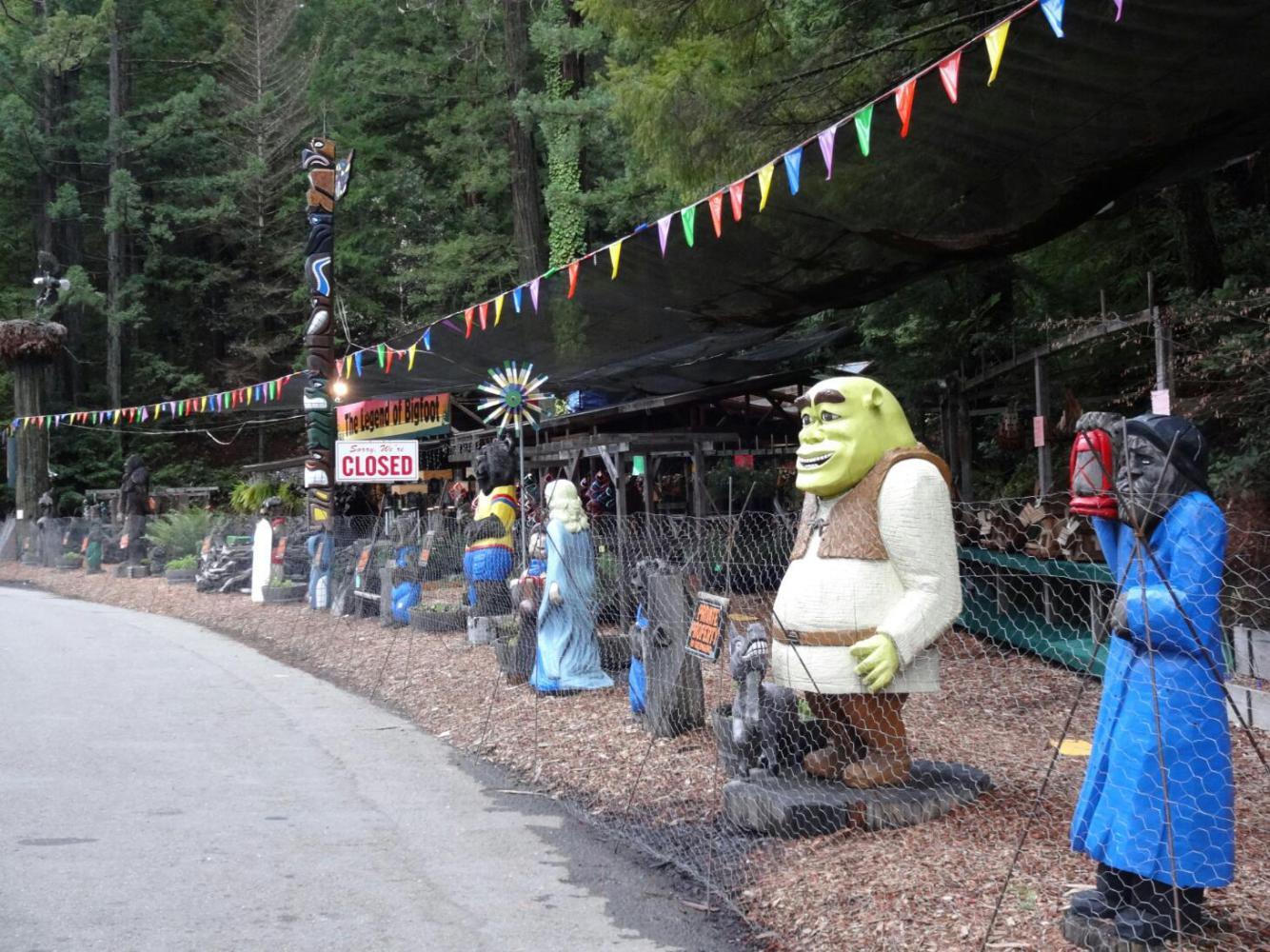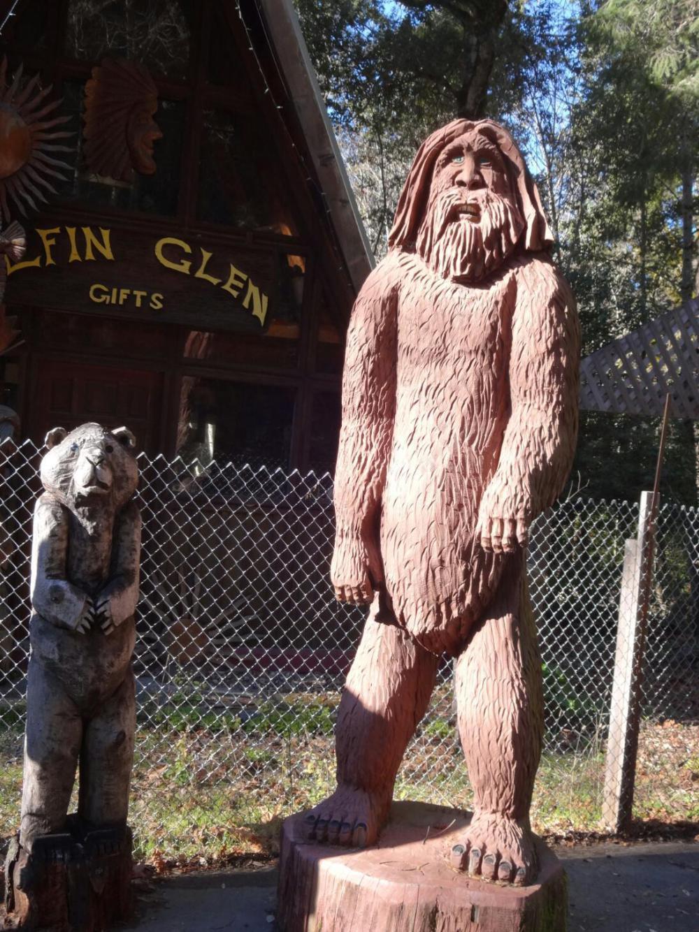The redwoods inspire tourist trap type development, usually based on a house within a tree, a natural chimney, or a drive through tree. These are lots of fun, as are the redwood carving places, which always have some version of Bigfoot. It seems natural to suppose that some sort of ancient biped would lurk in the ancient forest.