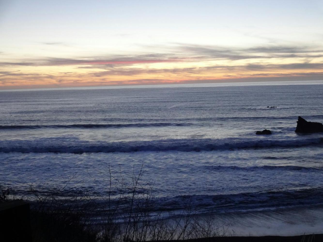 The swithcbacked road up over a mountain that stood between us and the coast climmbed immediately out of Leggett, and continued to climb for another 10 km or so. Then it descended and descended. Climbing, we got really hot and took off lots of sweaters. Descending we got really cold, and were glad of having new brake pads. The whole experience was tiring as can be, and since we had started way back in Garberville, it was just dark as we hit the coast.