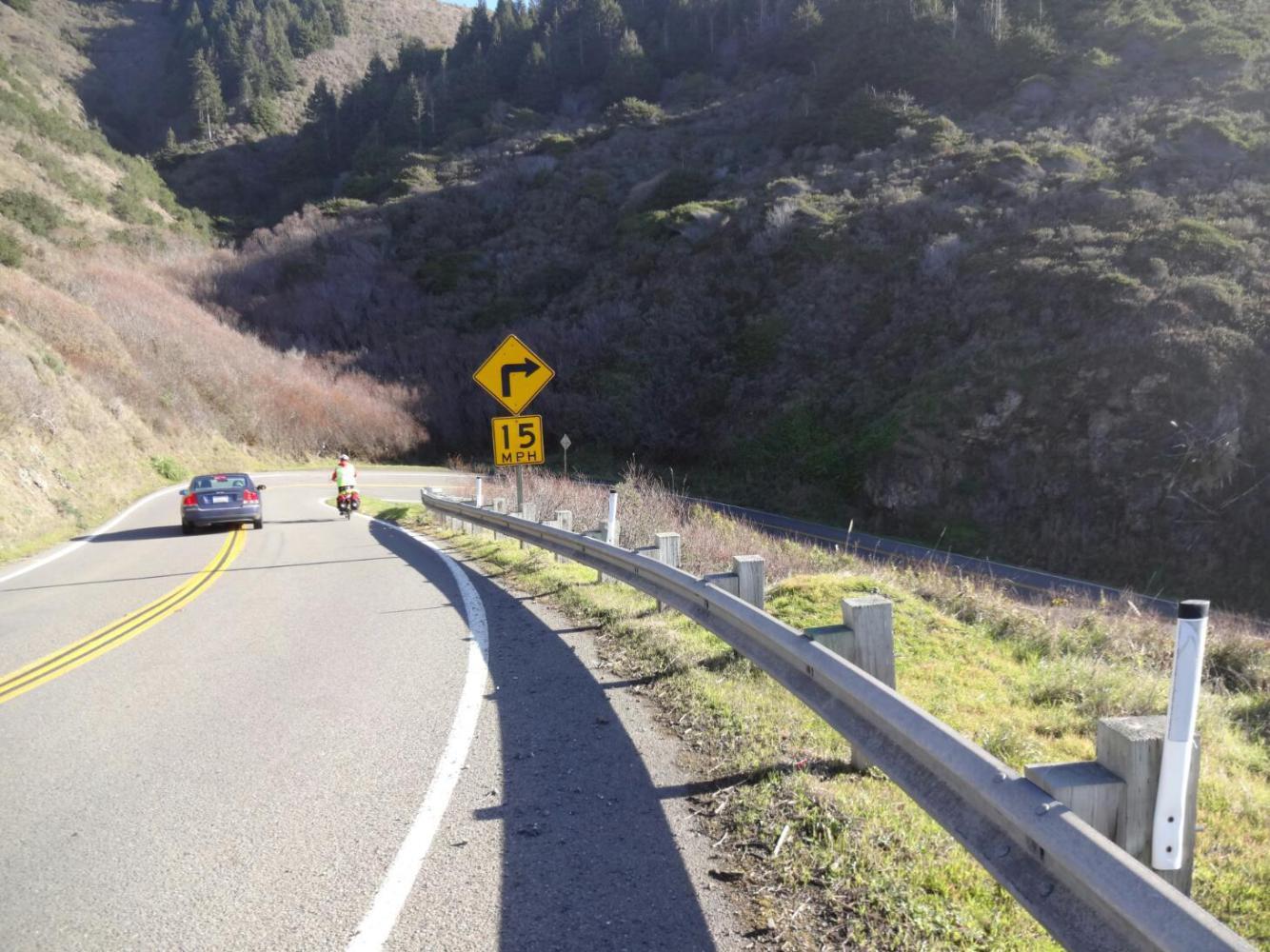 It wasn't long before we came to our first gulch, a spot where a stream enters the ocean. The road descends from the bluff in these areas, down, down to the stream level and a fair bit back inland, then it climbs up and out back to the bluff. In a car its a road shape that makes you wish for a Porsche. On a bike, its a bug because it's curvy with no shoulder and hence dangerous. The pull back up to the bluff is pretty steep too, and slows your progress a lot.
