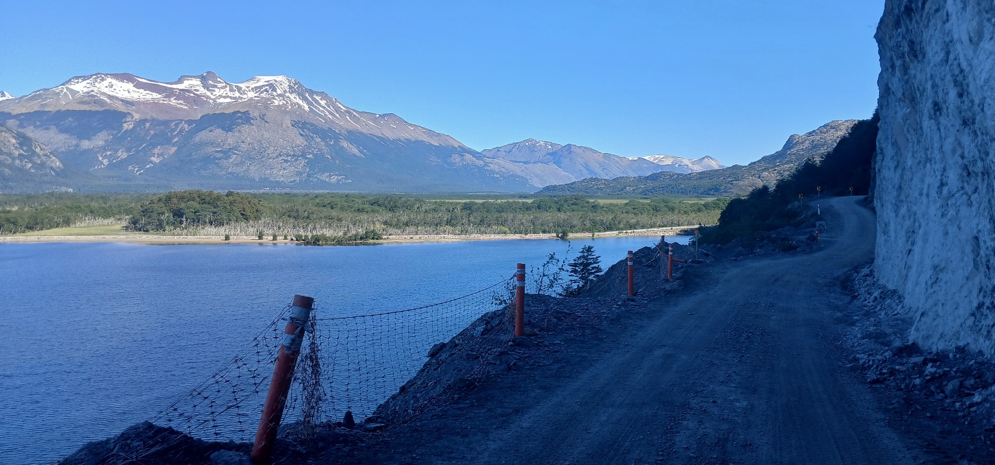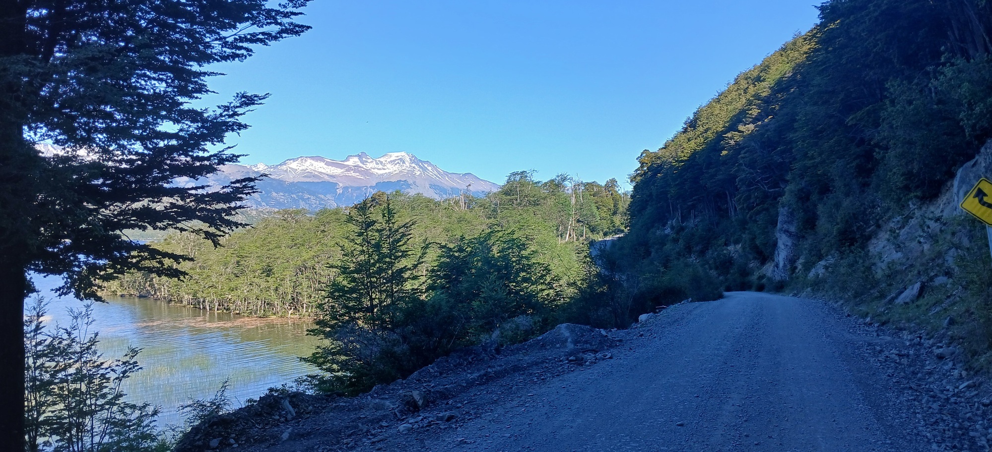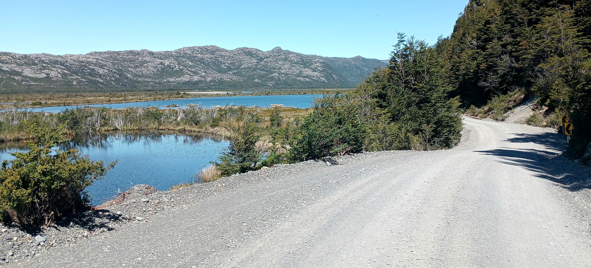 I have ridden this road twice in the past, but both times if it weren't raining, it was looking like rain with cloud low down the mountainside. Today as the afternoon wore on with a clear sky, I could see mountains I never saw before for the first time. An arid brown ridge like a camel's back dominated the view ahead, whilst a clear blue lake opened up below to the right, called Lago Cisnes, as the way curved around each crease in the mountainside.