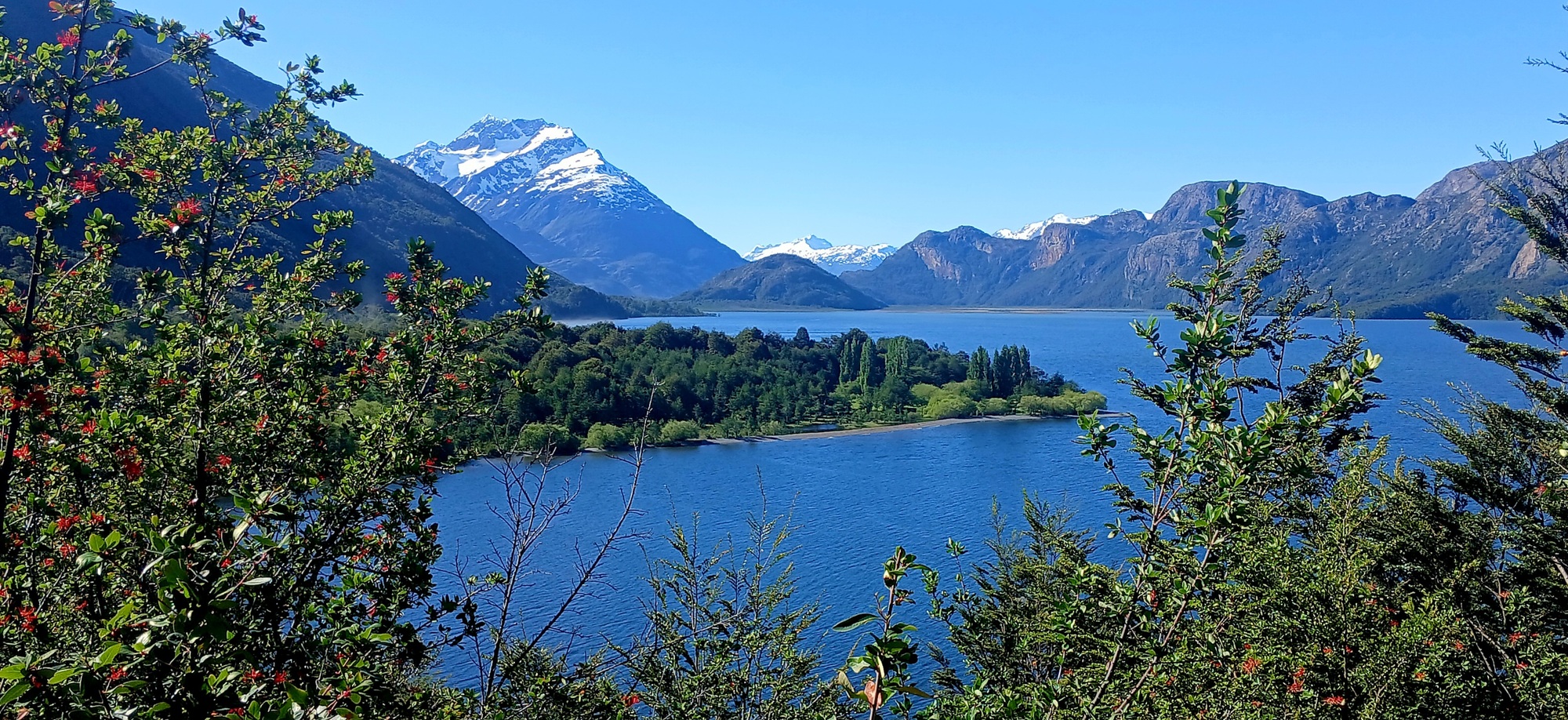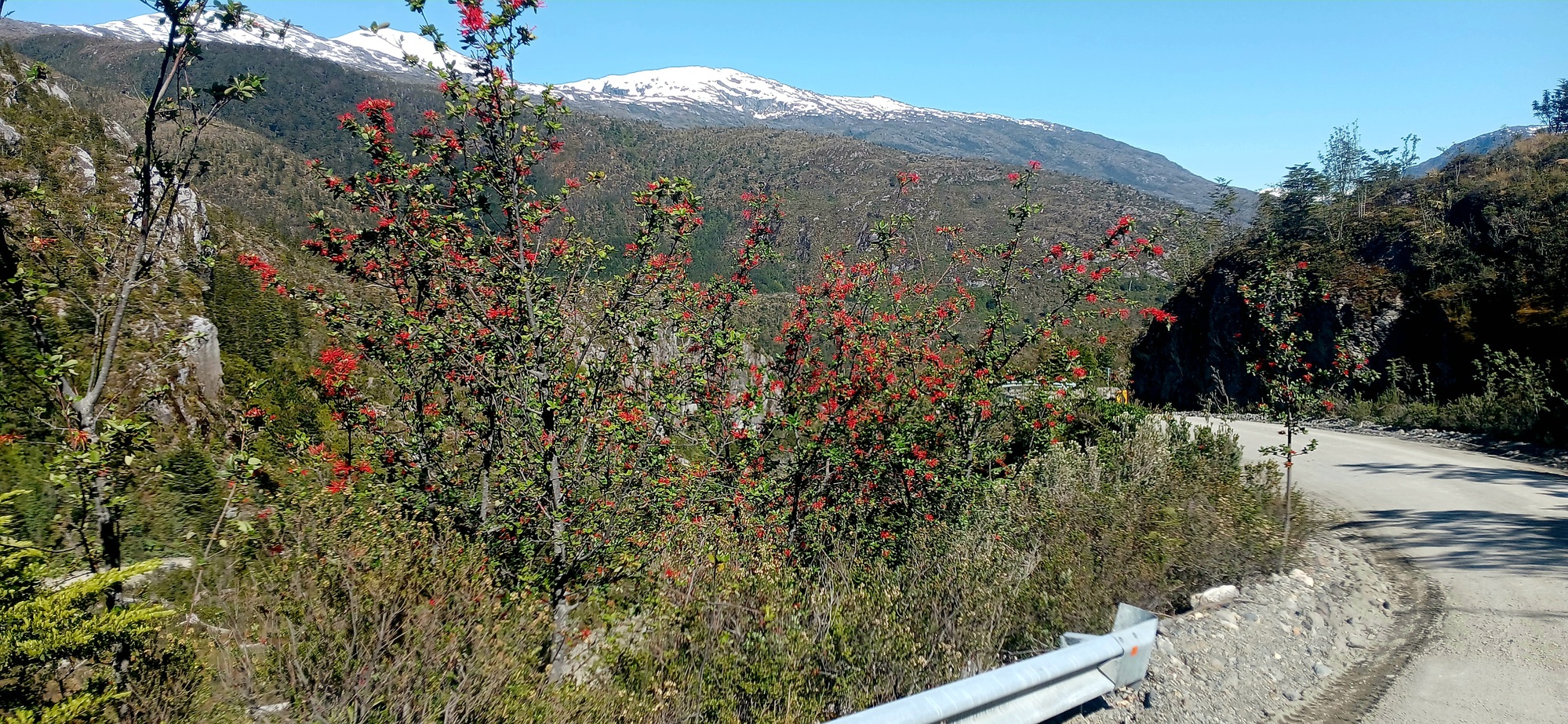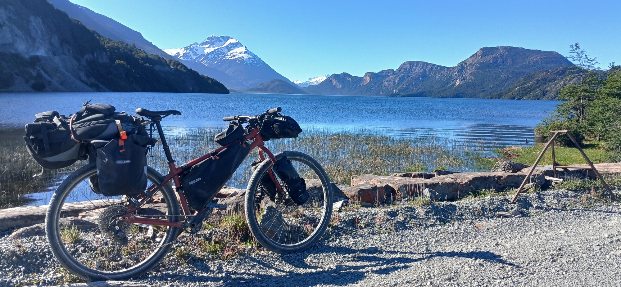 I have ridden this road twice in the past, but both times if it weren't raining, it was looking like rain with cloud low down the mountainside. Today as the afternoon wore on with a clear sky, I could see mountains I never saw before for the first time. An arid brown ridge like a camel's back dominated the view ahead, whilst a clear blue lake opened up below to the right, called Lago Cisnes, as the way curved around each crease in the mountainside.