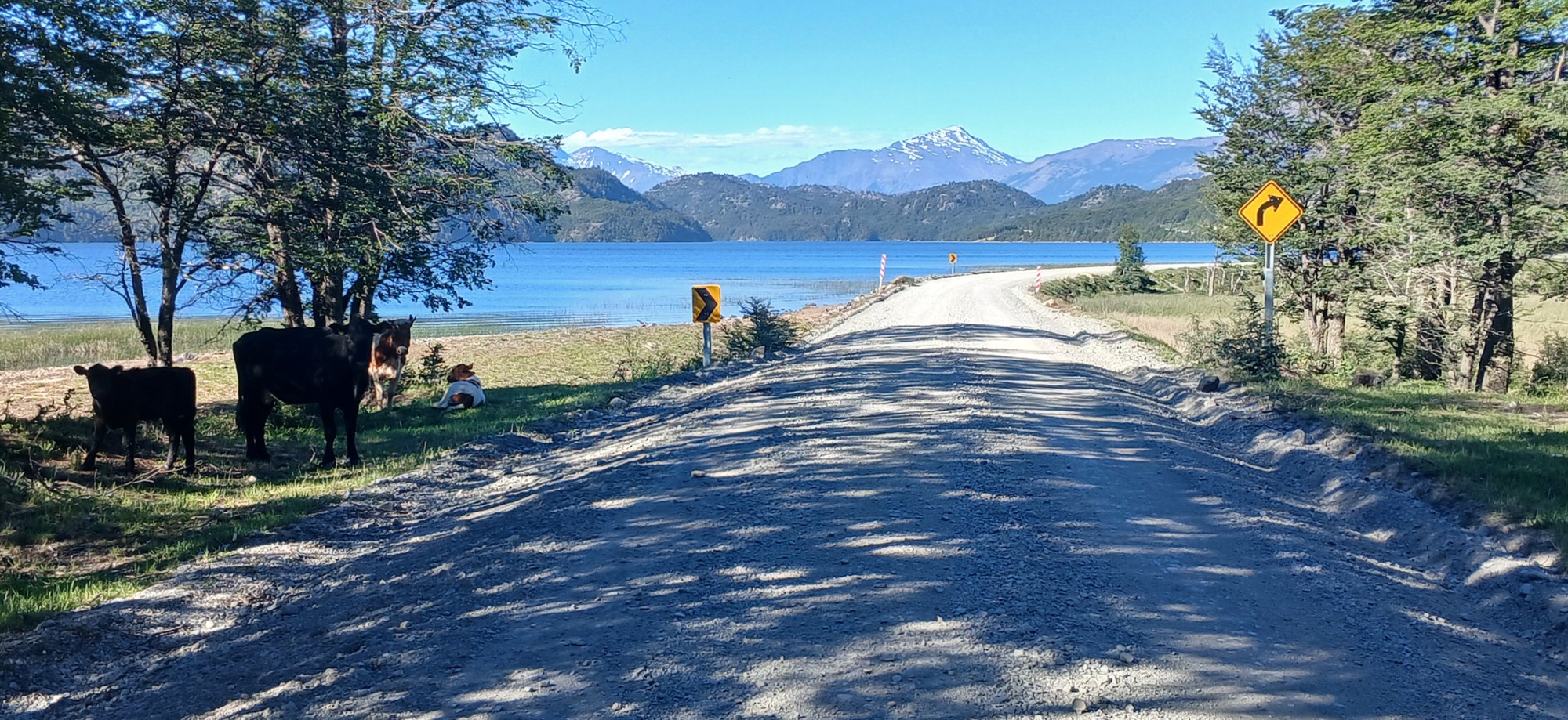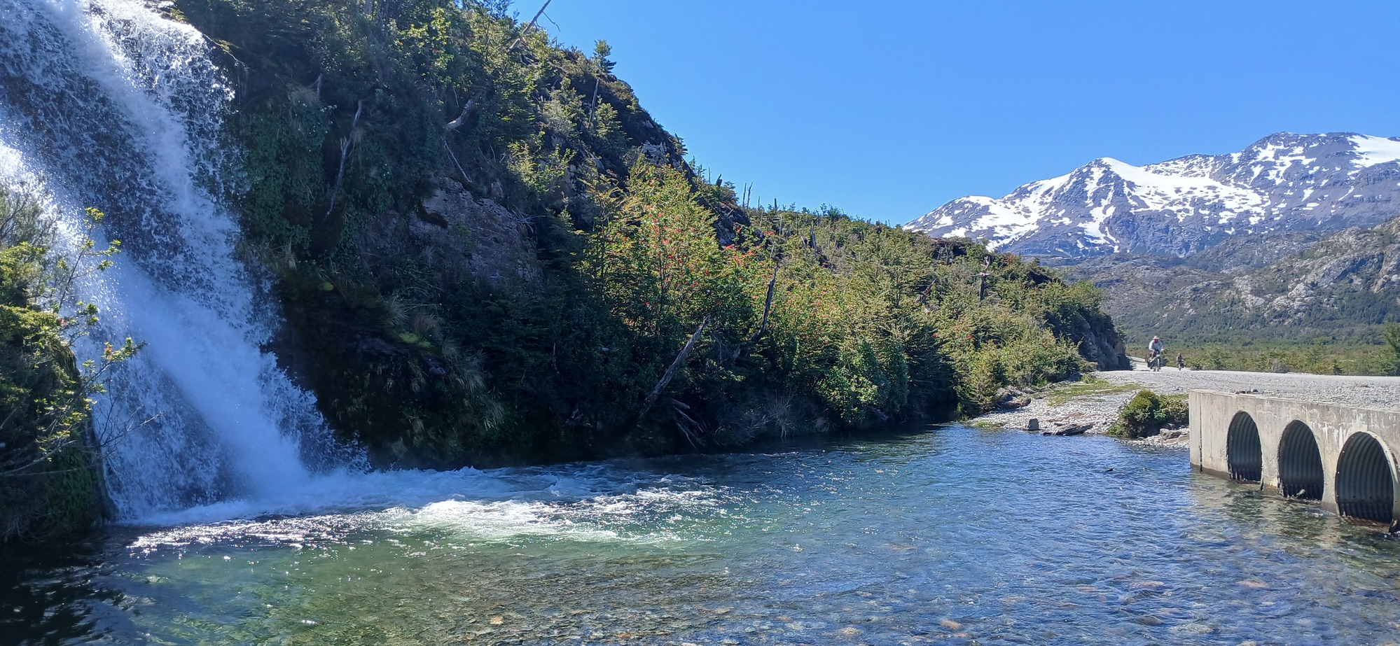 Eventually, there is a steep descend and the road goes left at the bottom, over a bridge and continues along a straight causeway along Lago Cisnes for about 5 kilometres to cross another bridge over Rio Mayer; whereupon, the road swings left to follow the riverbank, with a small road on the right, going uphill which leads to Paso de Mayer, a crossing into Argentina used by some cycle-tourists, especially late in the season when the popular crossing south from Villa O Higgins closes.