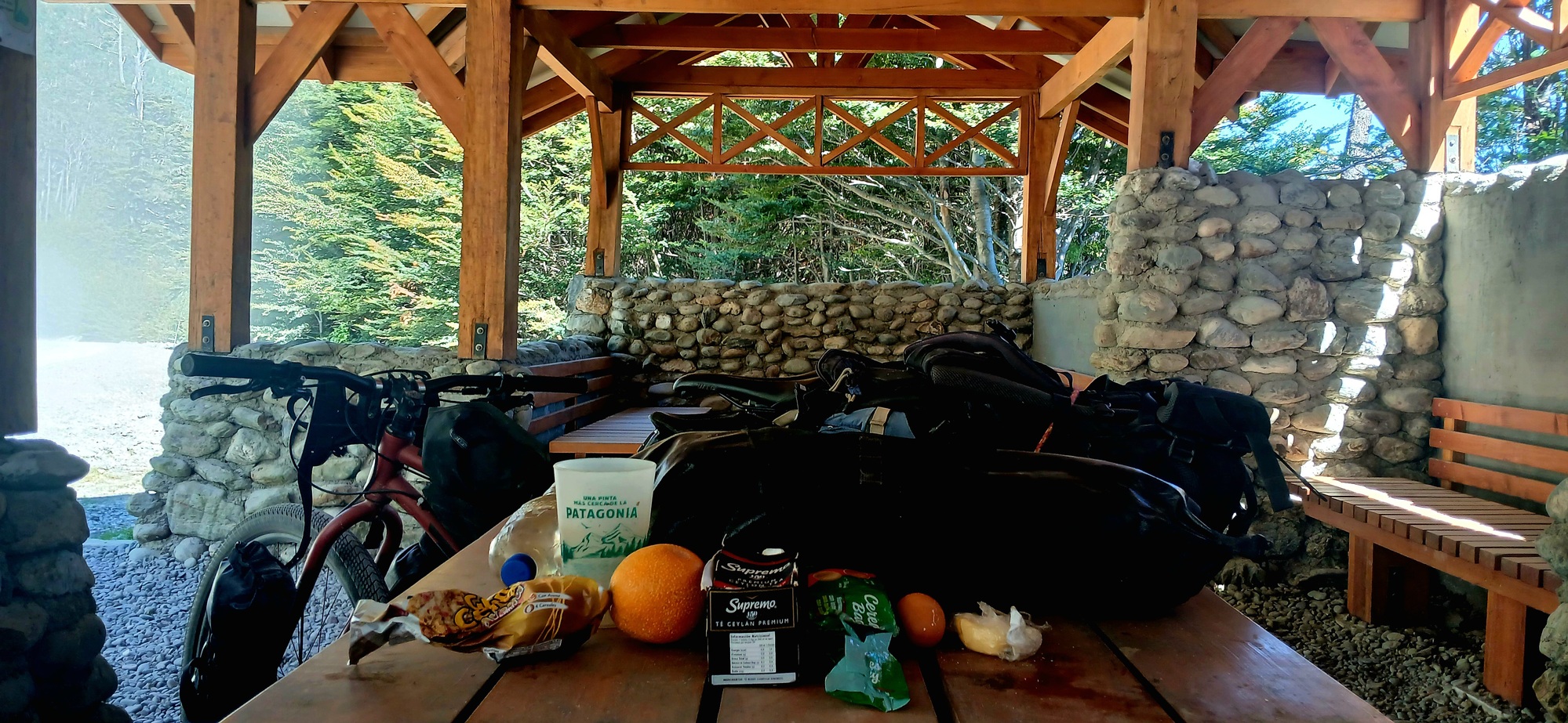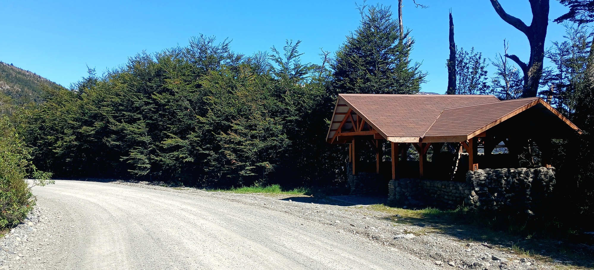 The climb continues, carved into the mountainside as it twisted and turned high above the valley and by 11.30, I reach an attractive wooden frame shelter put there for travellers, where I stop for a late eleveneses.