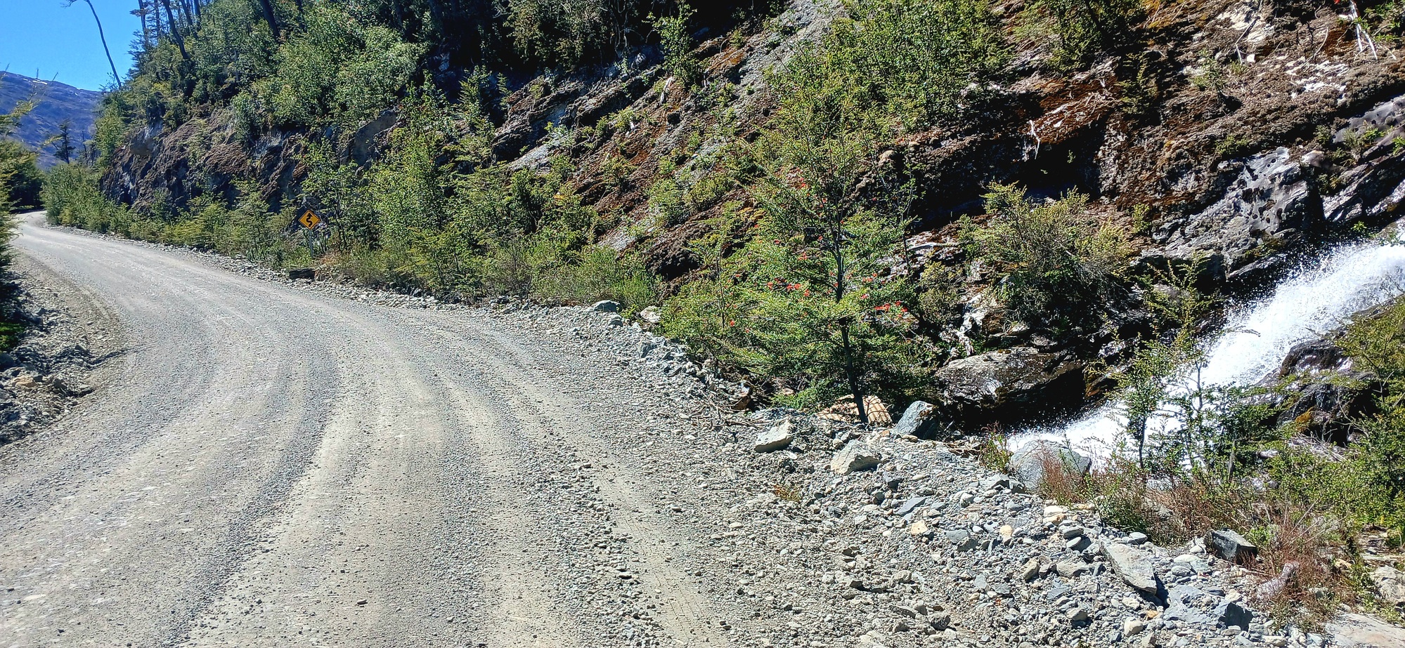 Starting off again, I take time admiring the stream cascading down the mountainside a little way up from the shelter. Any cycle-tourer overnighting in the shelter, there is a stone ring campfire and kindling, has a good water supply close at hand.