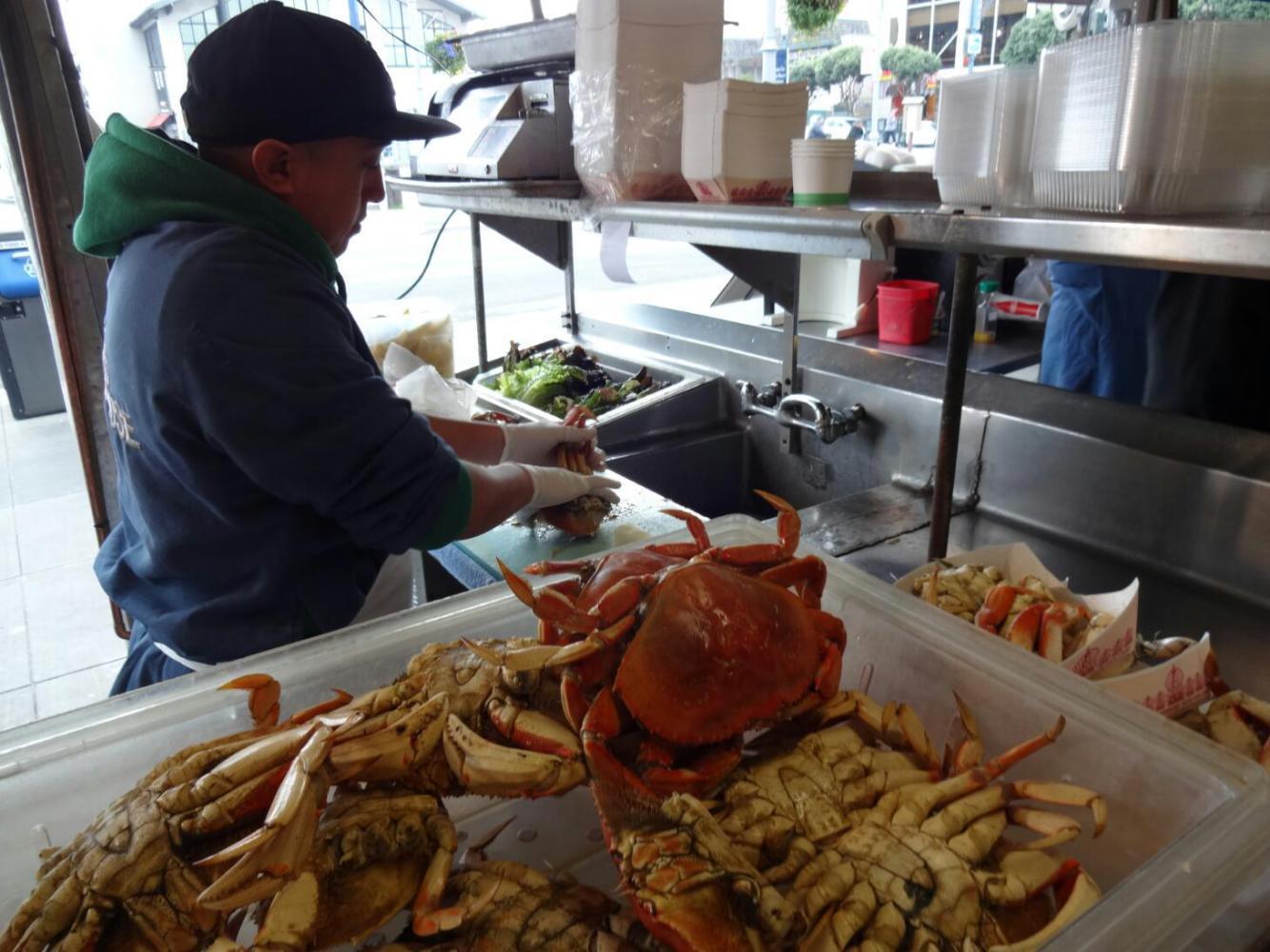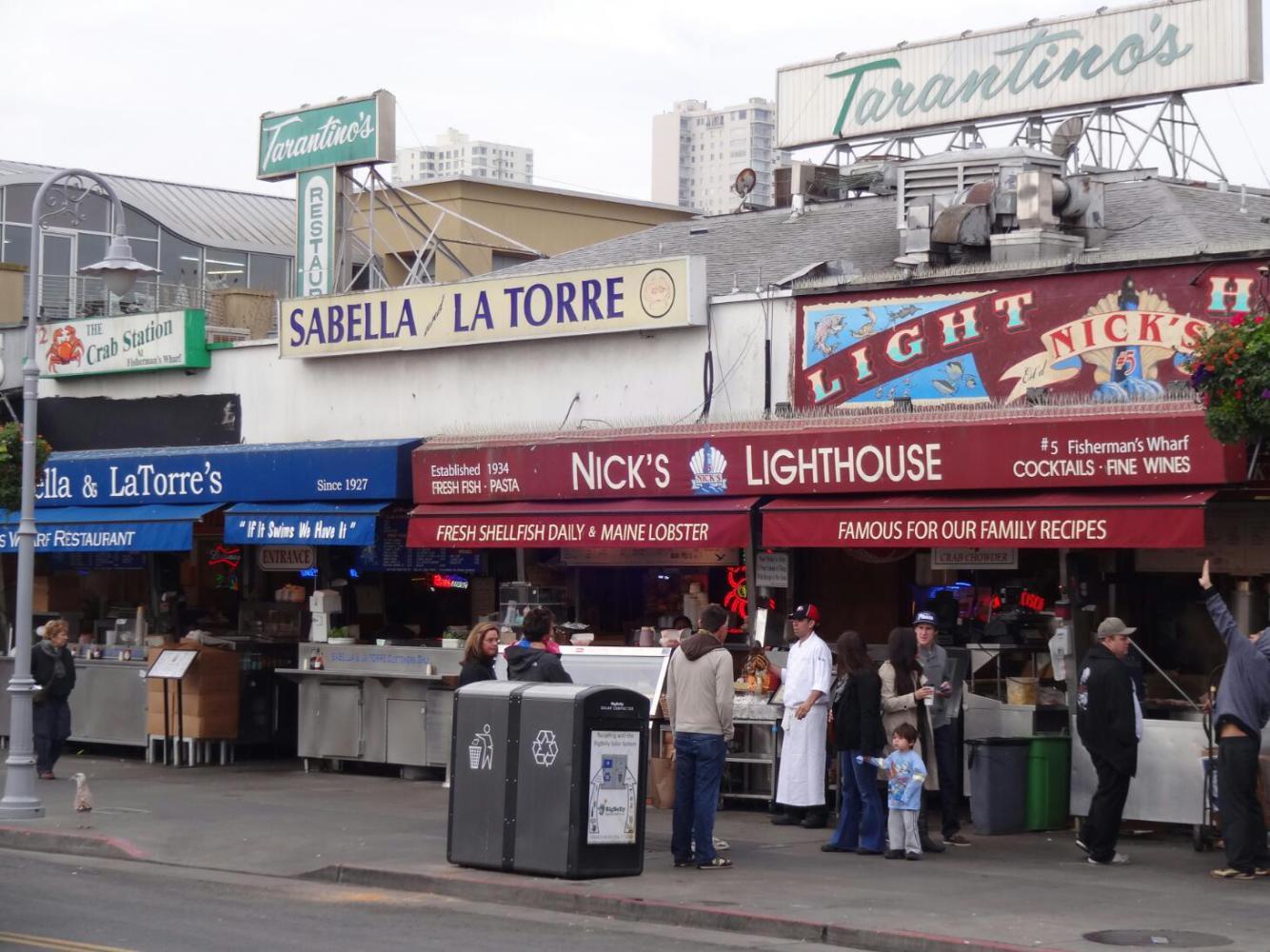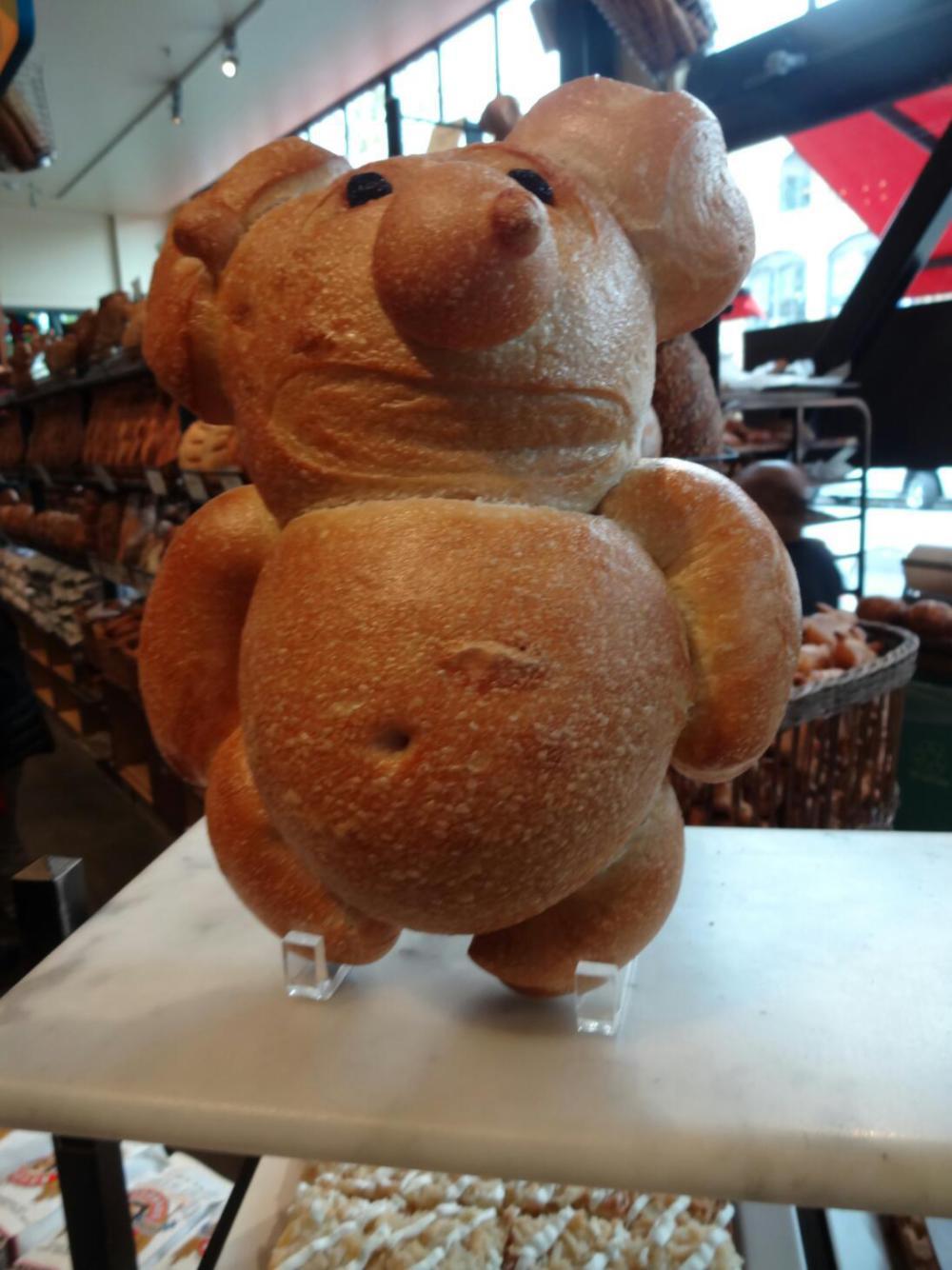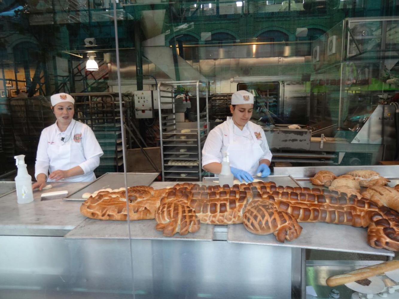 In keeping with the Fishermans Wharf showmanship, these bakers in the window can speak to passers by on the sidewalk with microphone and speaker. They will ask you where you are from and invite you in for a free sample. Note the giant alligator bread.