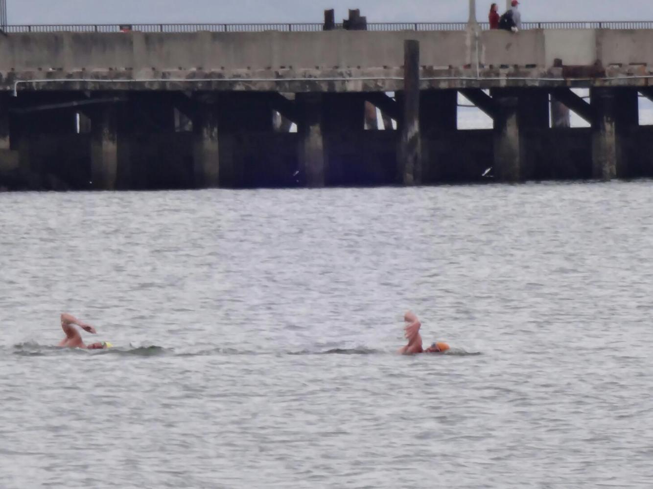 Swimmers from the nearby rowing and swim club. They routinely do stuff like swim to Alcatraz or swim the English Channel. We were bundled up in sweaters and raincoats when we snapped this shot!