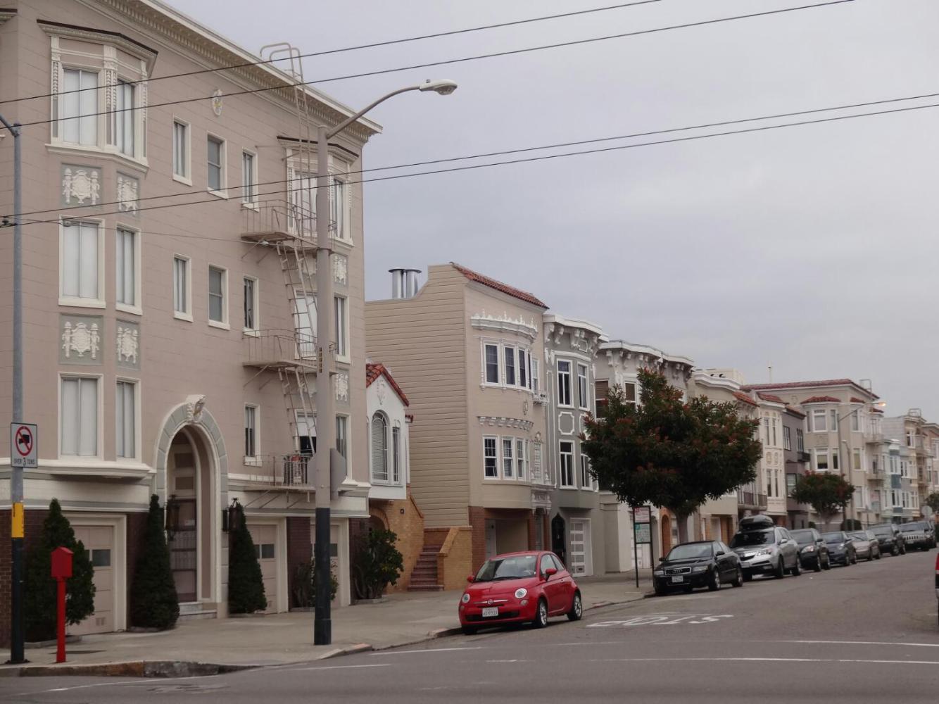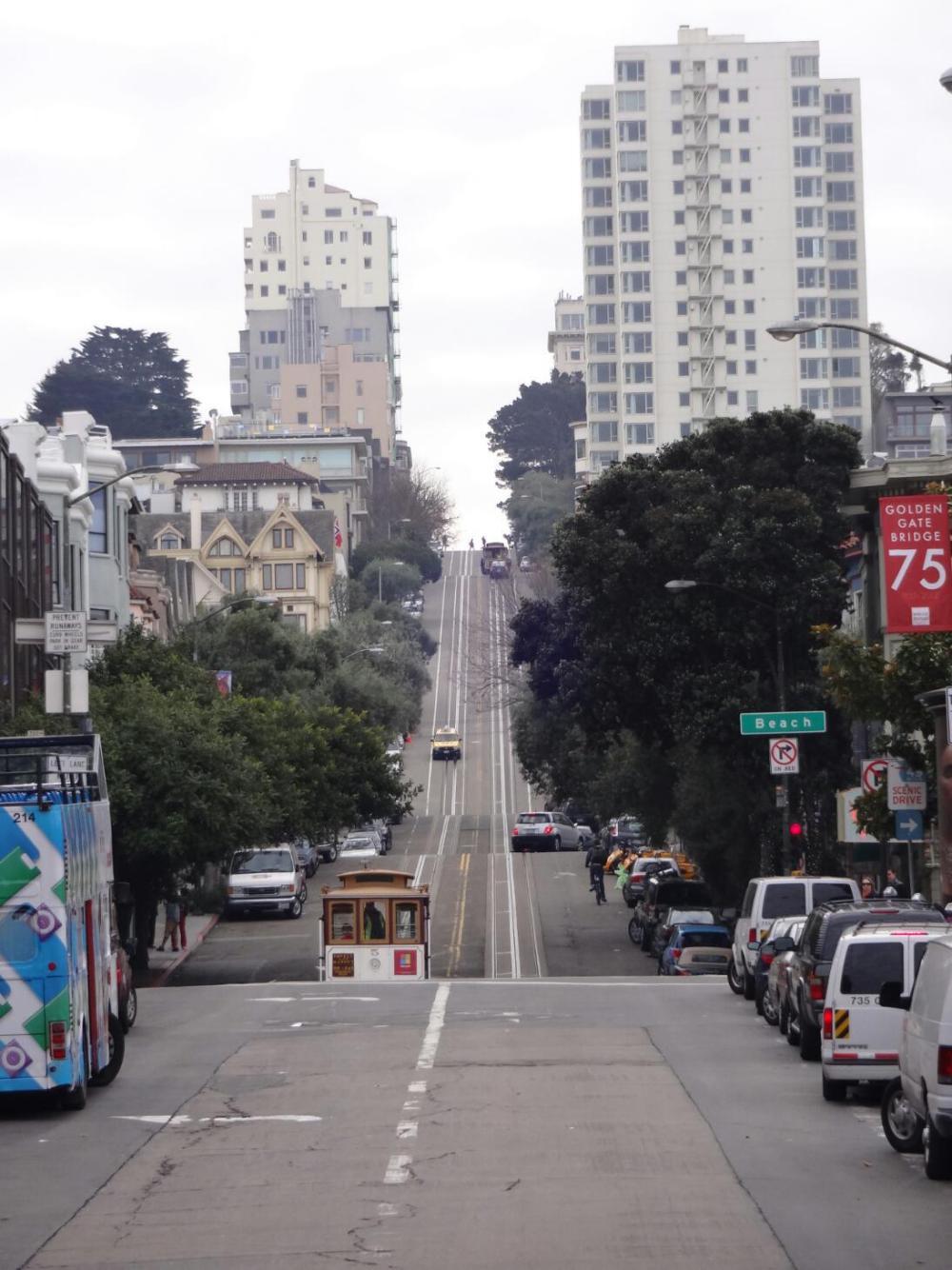 First off there are those Victorian style three story houses, done up with gingerbread style decoration and decorated in shades of white or pastel. The "painted ladies" are a line of such houses often seen in postcards, but at least 14,000 of such buildings have been preserved in the city. Second there are the hills. Parts of the city are flat, but then zap!, the street goes up at 45 degrees.