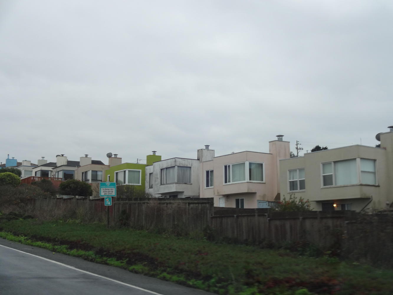 Around Daly City and Pacifica the houses are packed onto the hillsides very tightly. They are small, squarish, and multi-coloured, the exact houses made out of ticky tacky referred to in the song "Little Boxes".