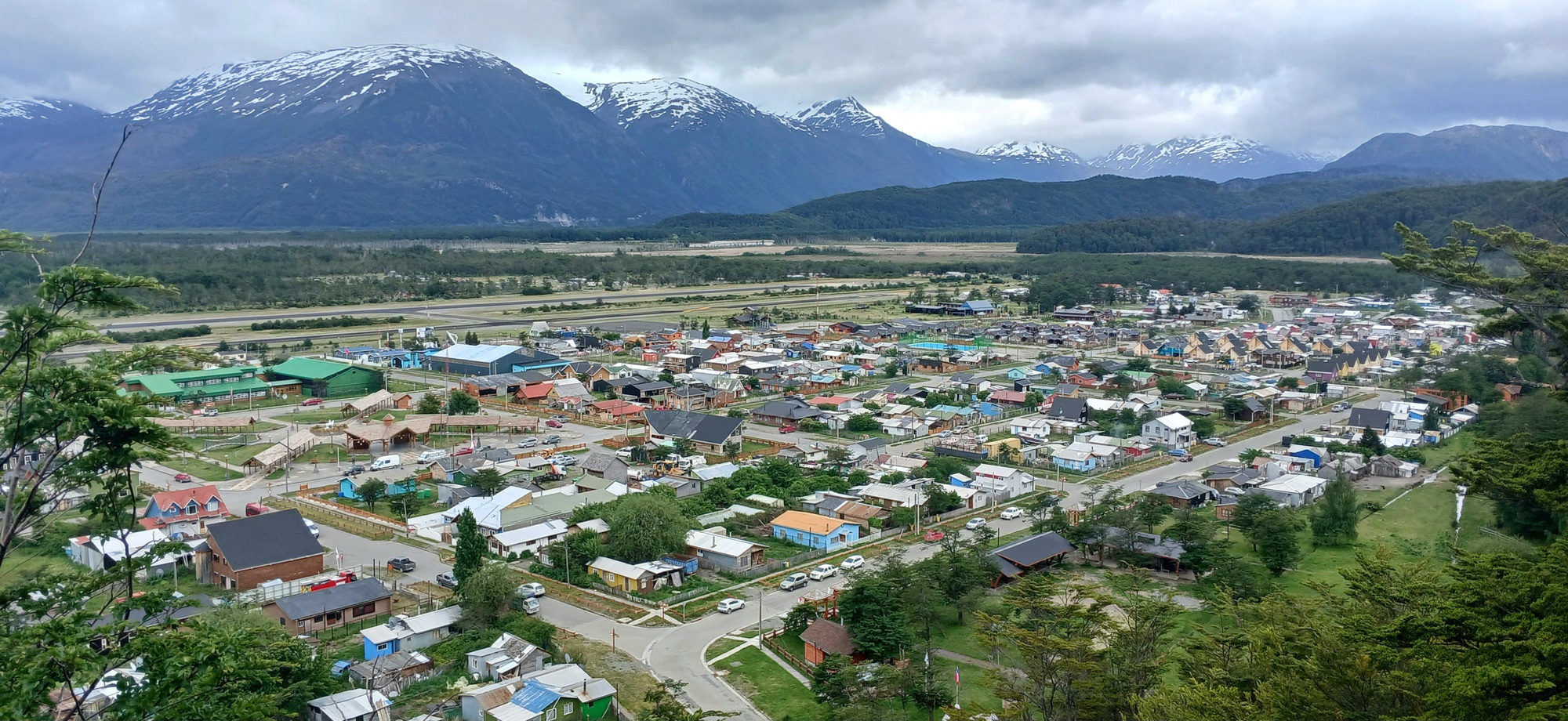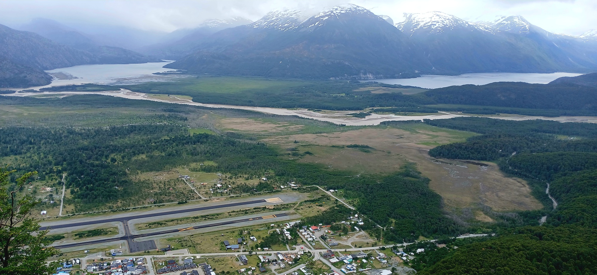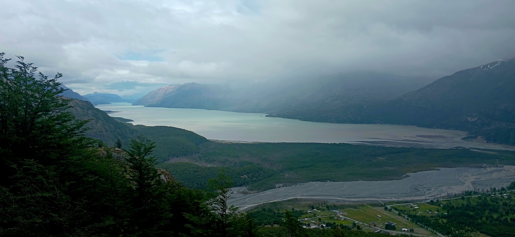 I bought my boat ticket for today, Monday; but, due to strong wind being forecasted, the sailing was moved forward to Sunday evening, so I missed it. The ticket though is tranferable to the next scheduled sailing. Thereby I'm here for a few days more. Not a bad outcome as although this is a small place, it attracts a lot of visitors and therefore has quite a few family run supermarkets and restaurants, so there is a good variety of food. Furthermore, located in a southern Andes valley, the scenery is stunning. There are a few hikes. Today I hiked up to a viewpoint on the hill to the east of town with a great panaramic view of Lago Cisne to the right, where the 7 comes down along, Lago Ciervo in the middle and Lago O Higgins off to the left. Apparently, the Northern Icefields are visible on a clear day when the cloud isn't down on the mountaintops like today.