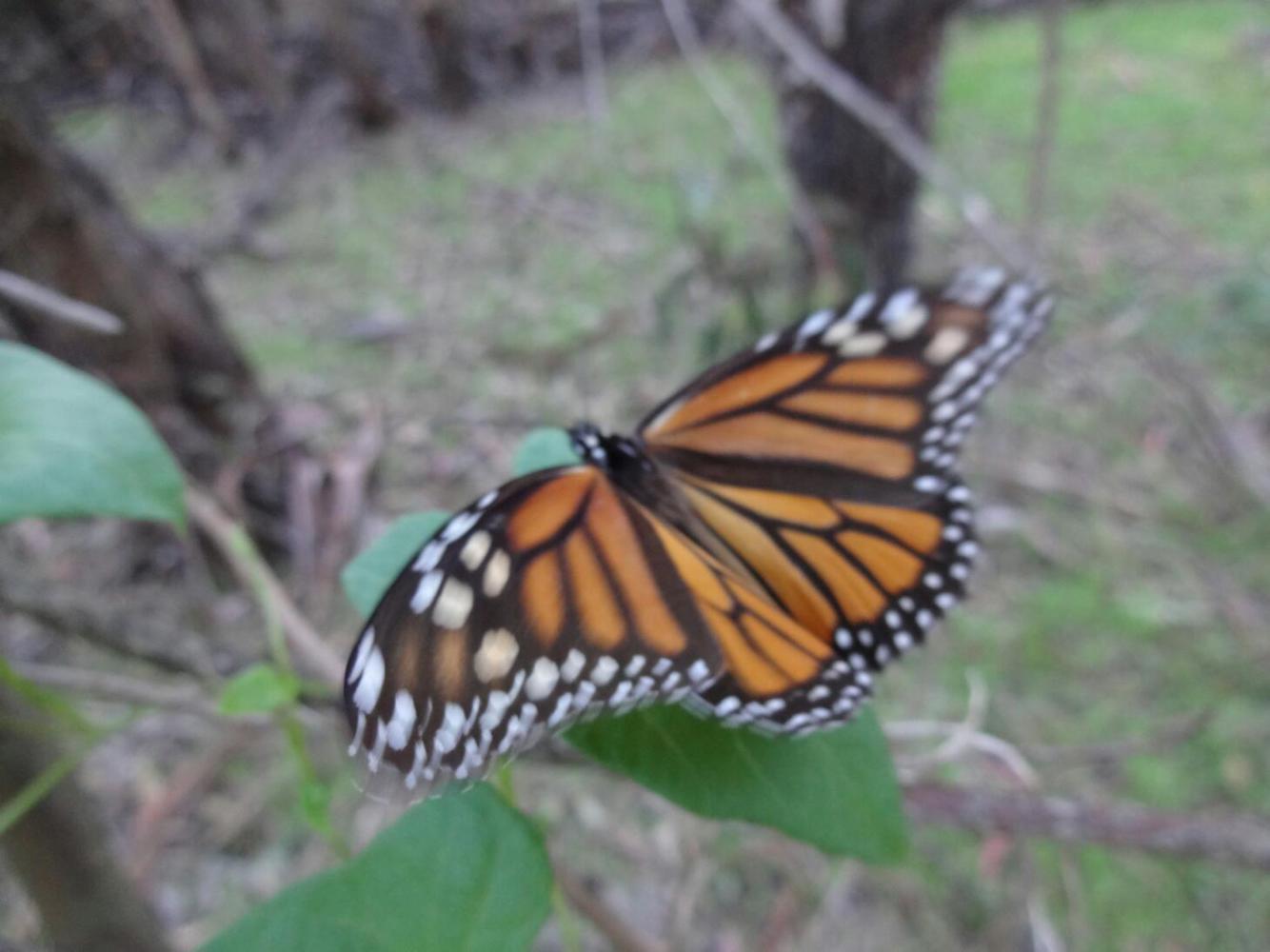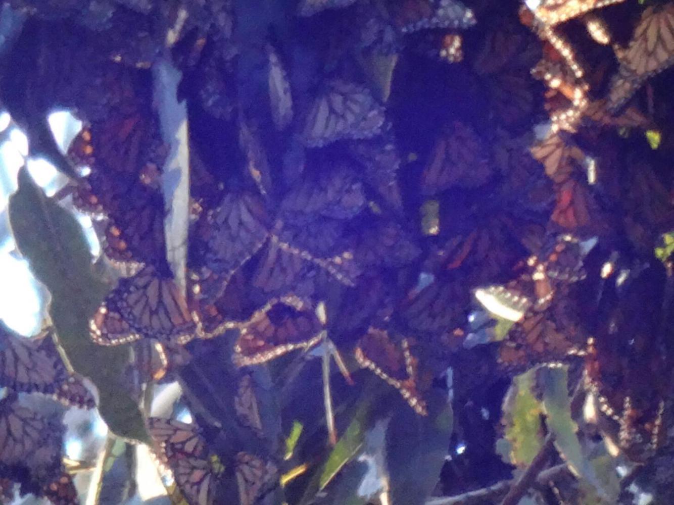 It was along this way that we encountered the Goleta Monarch butterfly grove. The day was drawing to as close and we knew we still had a ways to go before reaching any sort of accommodation. But how often do you see a butterfly grove. (Ok, based on recent experience, it's every day!). A little spoiled by Pismo Beach, we rather expected the butterflies to be right there. Both the on site maps and the people around seemed to indicate that it was just a "short" walk. We set off, and soon found ourselves in a bit of a maze of dirt pathways. We followed little butterfly signposts deeper into the park, and did eventually reach the trees. Unfortunately it was now late enough in the day that the butterflies were fully clustered. Only one had yet to join its friends, so there was a chance for one quick photo.