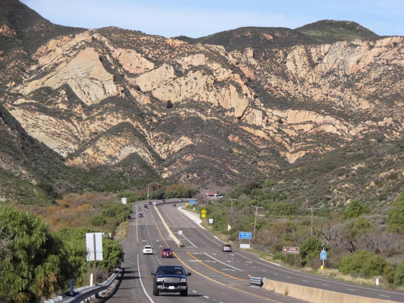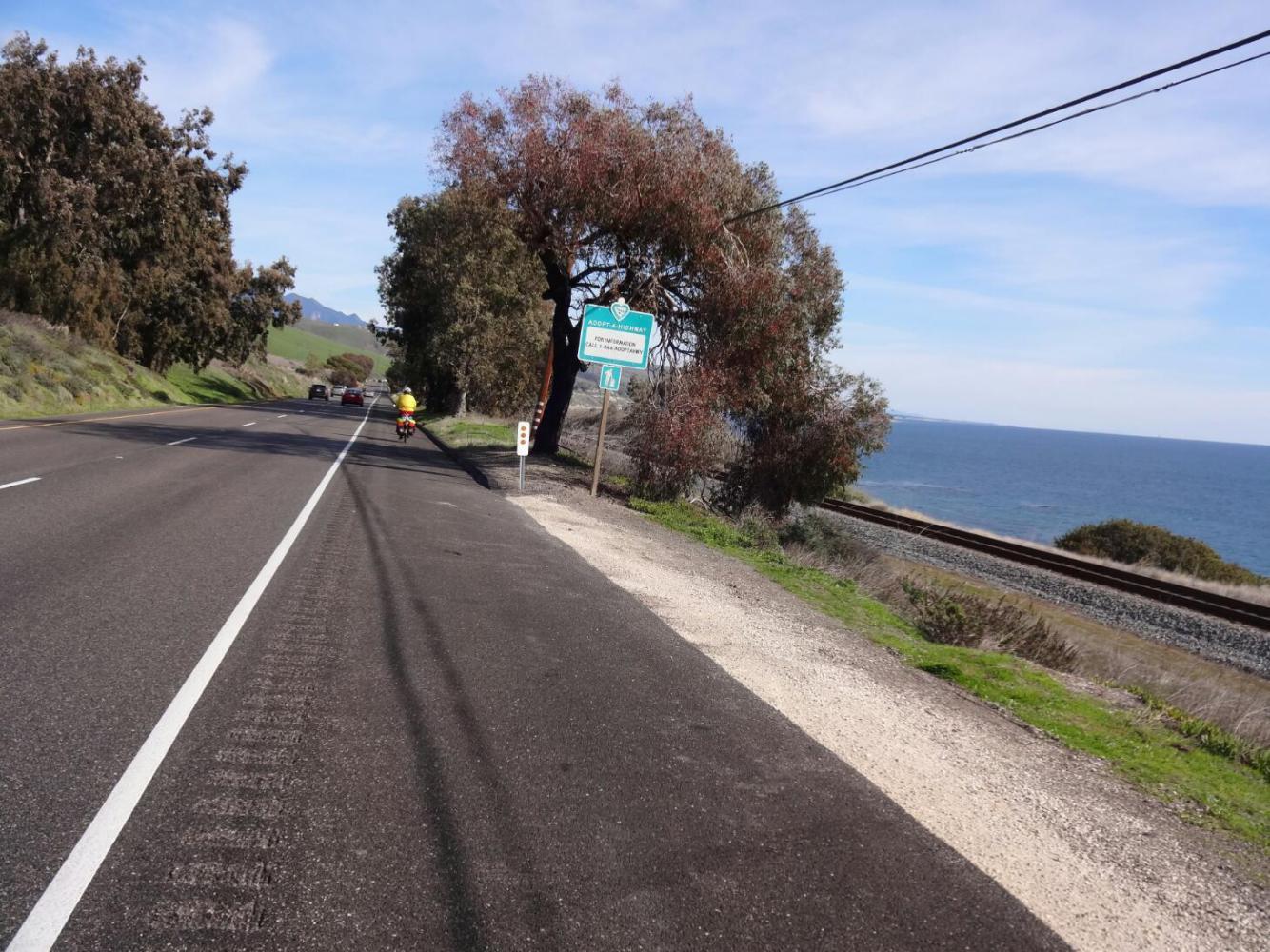 The road, highway1, rose in very long and fairly gentle slopes, for twenty or thirty kilometers. Finally, it joined 101, and together they plunged out of the mountains and to the sea at Gaviota State Park. We could then cruise along the sea coast on 101. Though it is a freeway here, the shoulder is wide and protected by a rumble strip. In the distance we could see the Channel Islands, and nearby - just by the shore - the Amtrak track. This is the very line we will be on when in time we set off back to the frozen north.