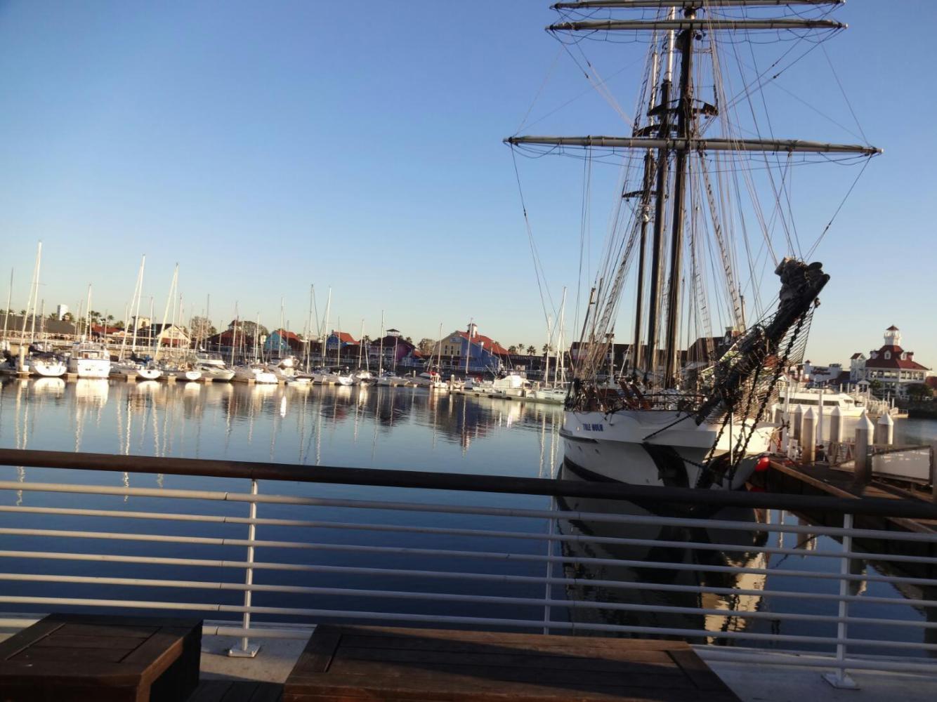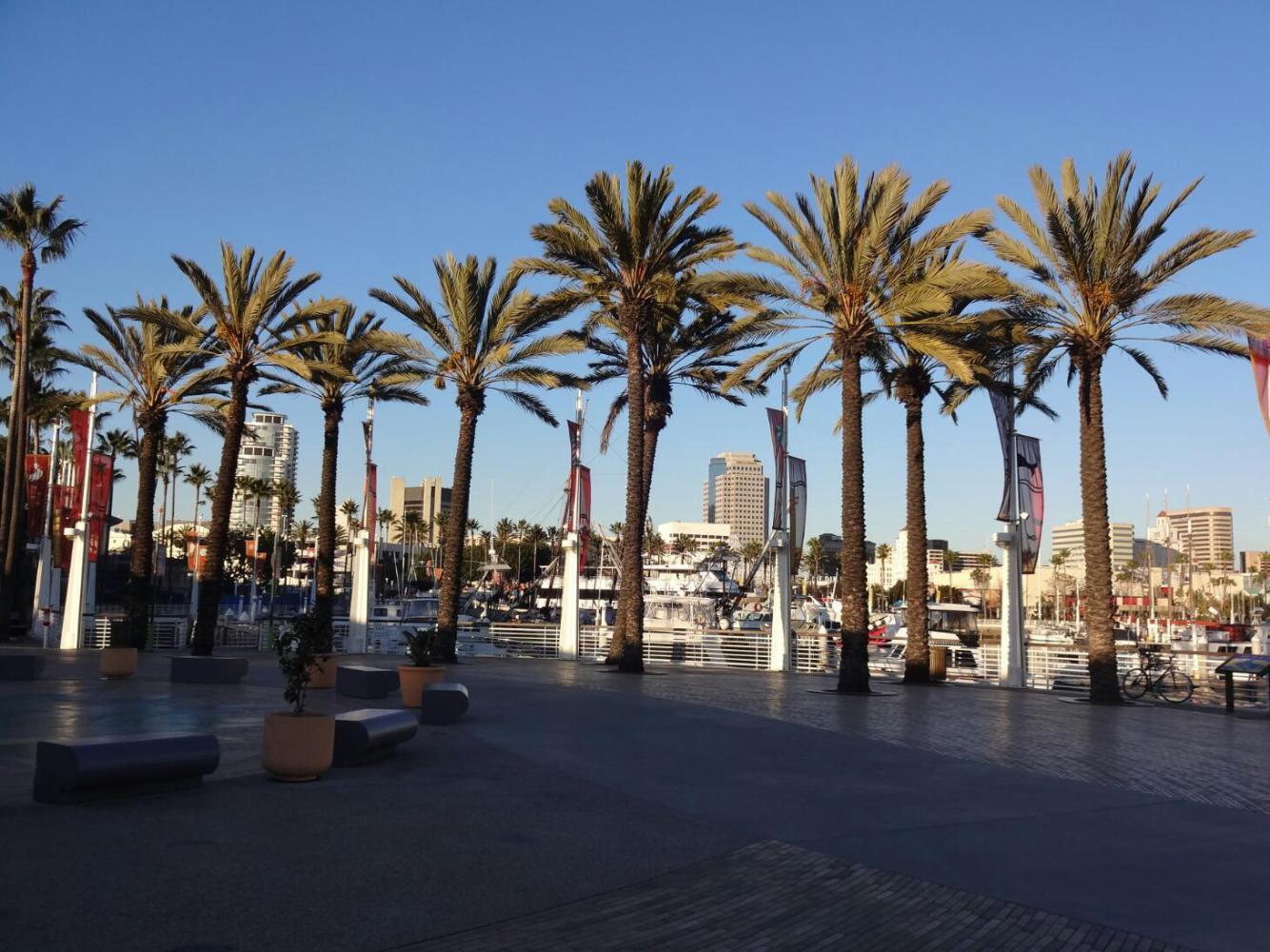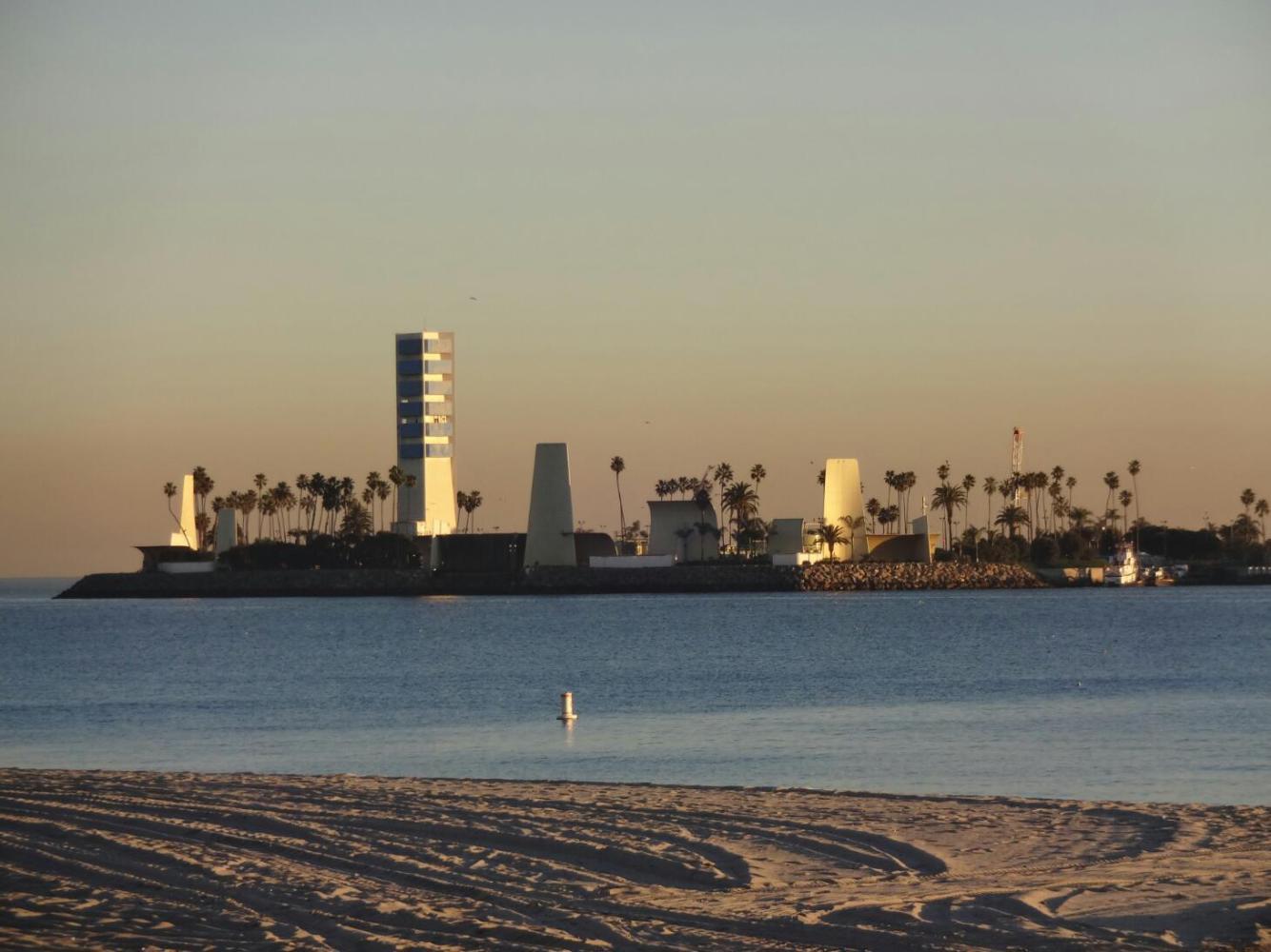 Here, the sights include the long sand beach with many joggers and the super bikeway, the Queen Mary cruise ship which has been converted to a hotel, and the offshore islands which were created as part of the exploitation of extensive oil reserves in the area.