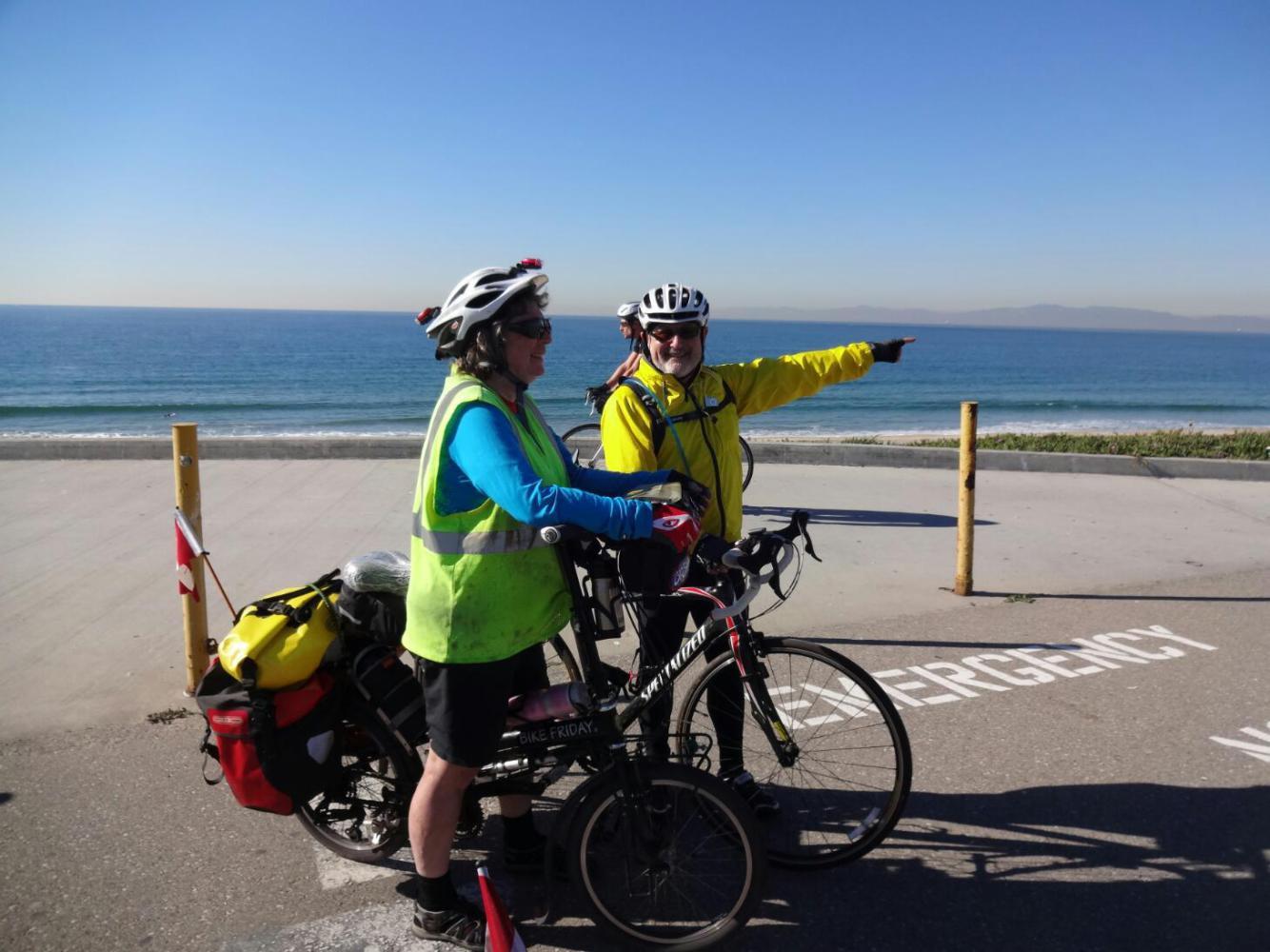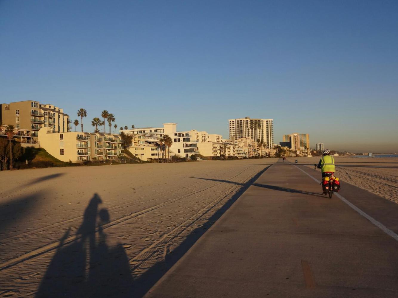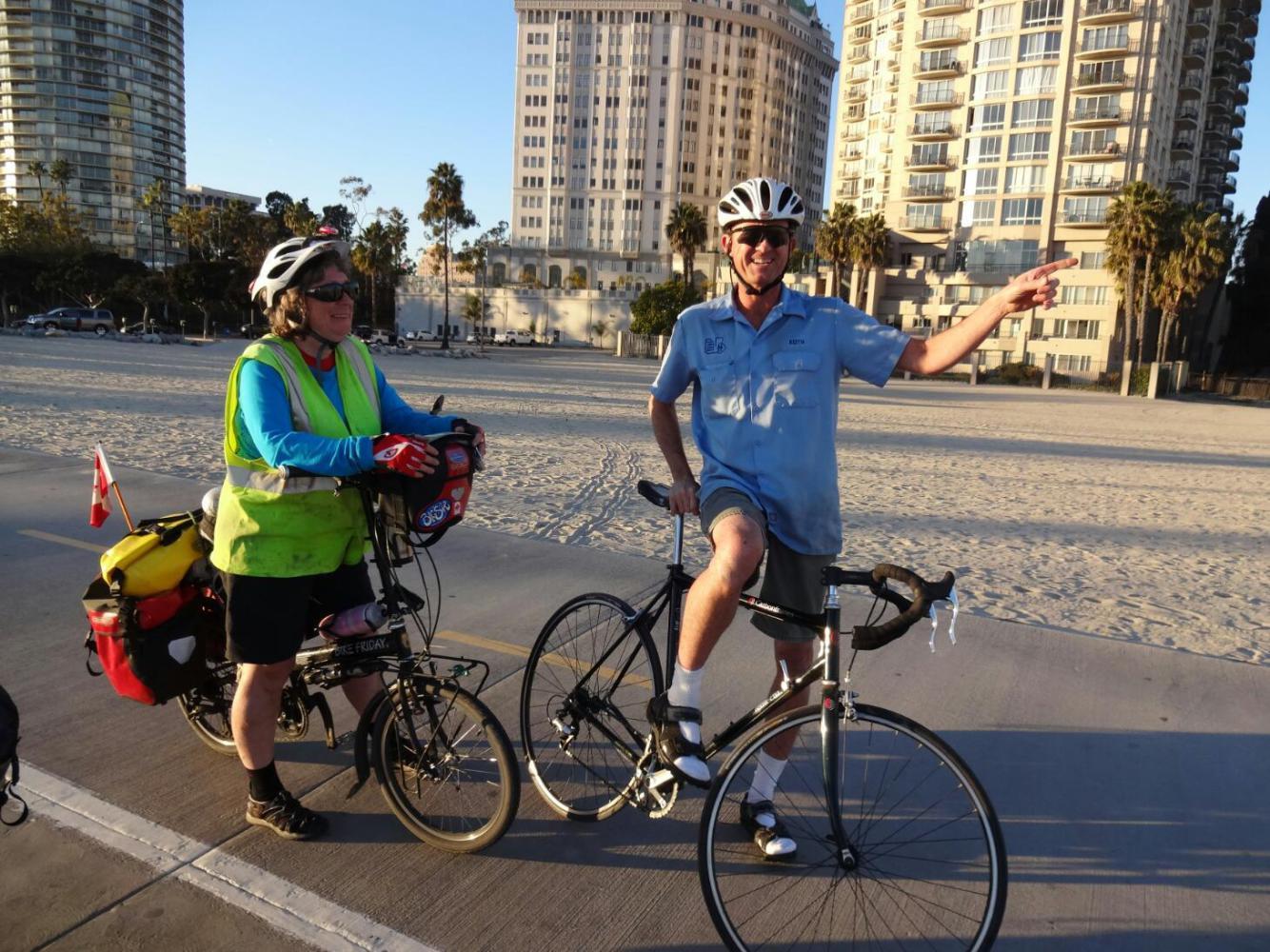 Looking toward Long Beach from the path, one sees in the distance high rise buildings of a major centre. And just by the path, under the freeway bridges, homeless people set up with tents. Suddenly, though, we arrived at Long Beach by the ocean, and it seemed extremely pleasant, with boats and restaurants, and trees and plazas. The bike path became confusing, but immediately our road angel for this place - Keith - appeared and guided us on his bike through the maze. Keith set us on the beach path that leads to Seal Beach.