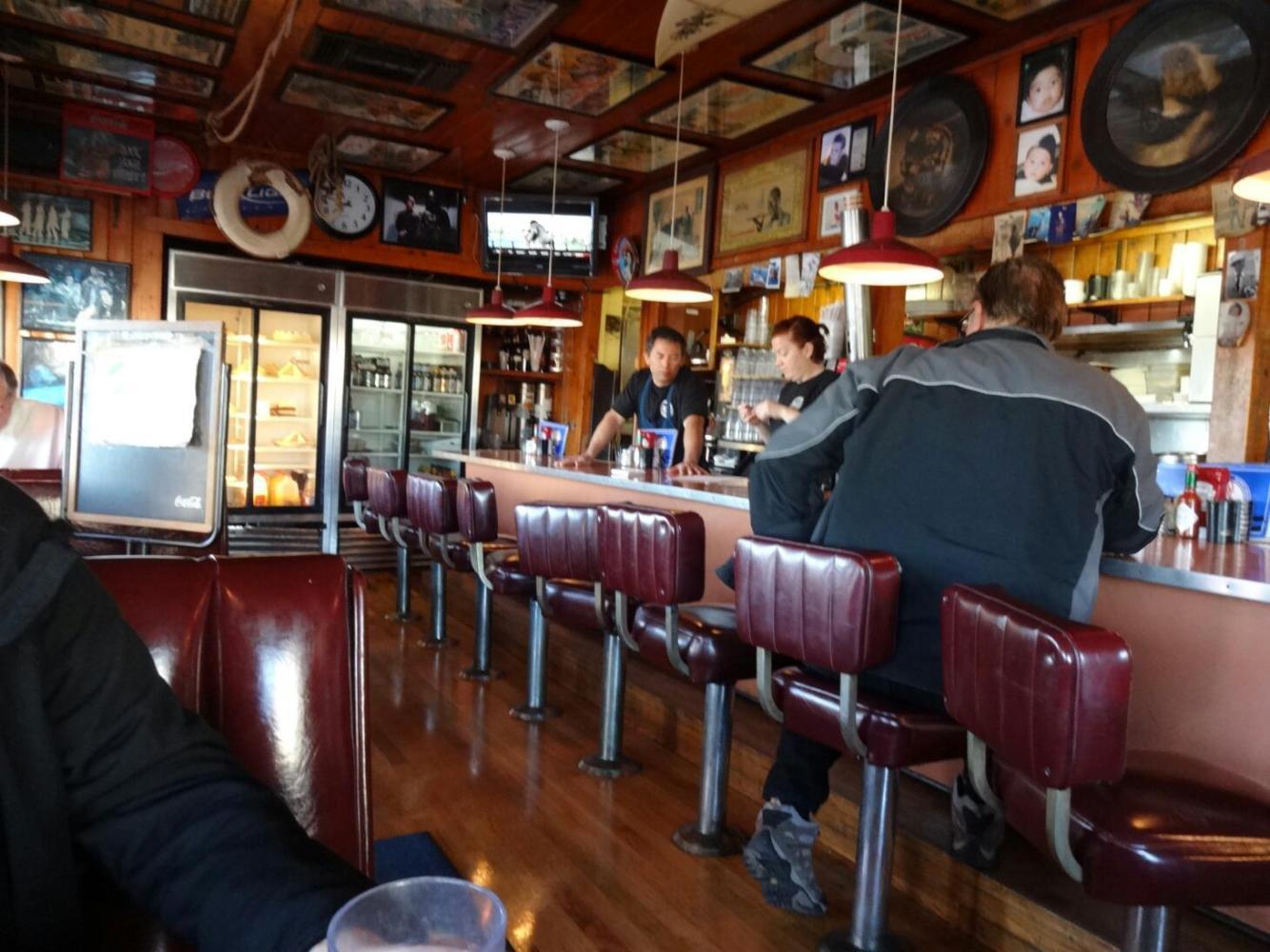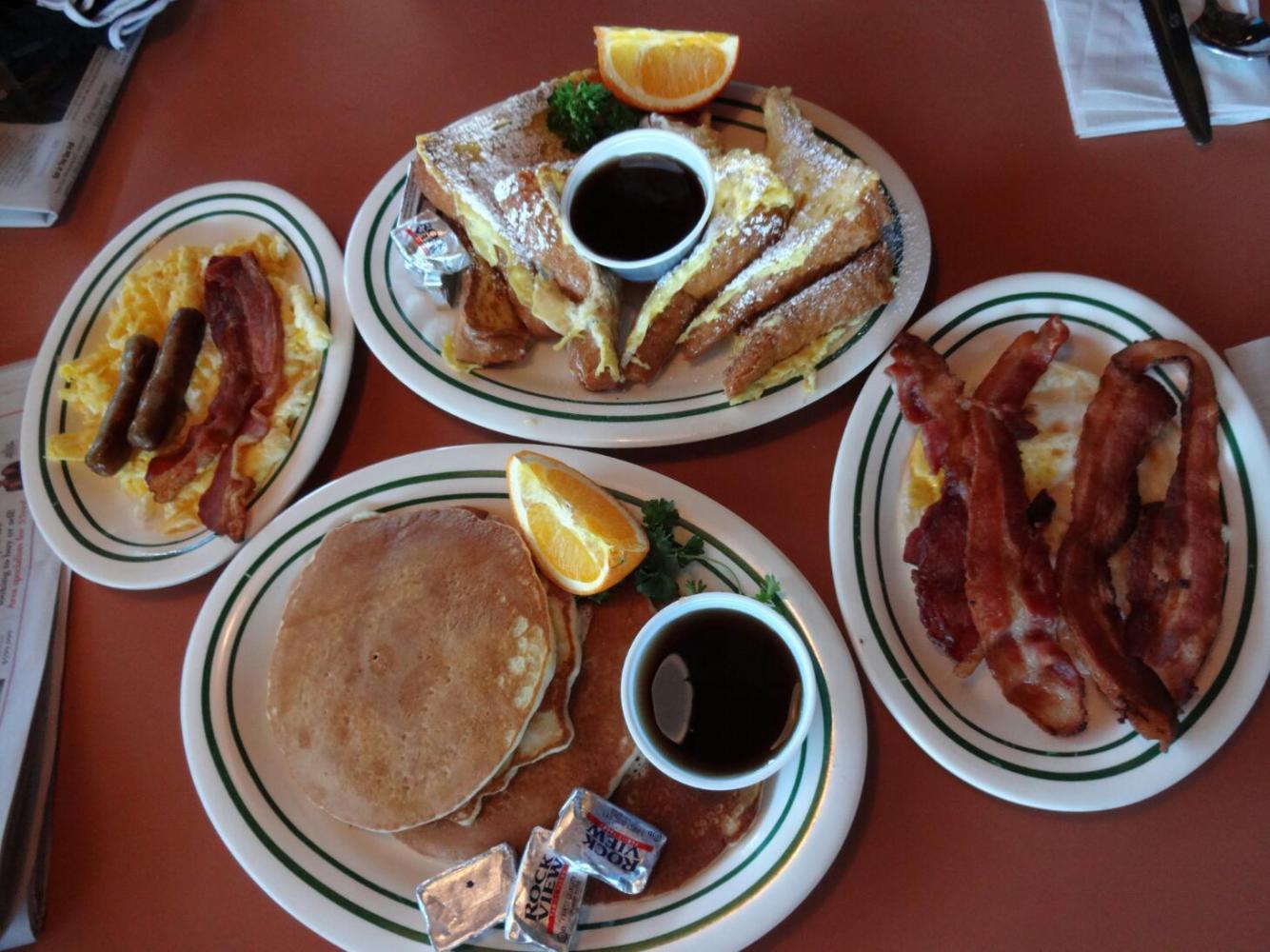 The lady running the motel insisted that the most wonderful diner was a block away on the other side of the highway. So instead of our usual instant oatmeal we sleazed on down to check it out. We thought about ordering one breakfast and splitting it, but went beserk and got one each. When the two plates were brought I thought that would be about right. But then the second two plates arrived!