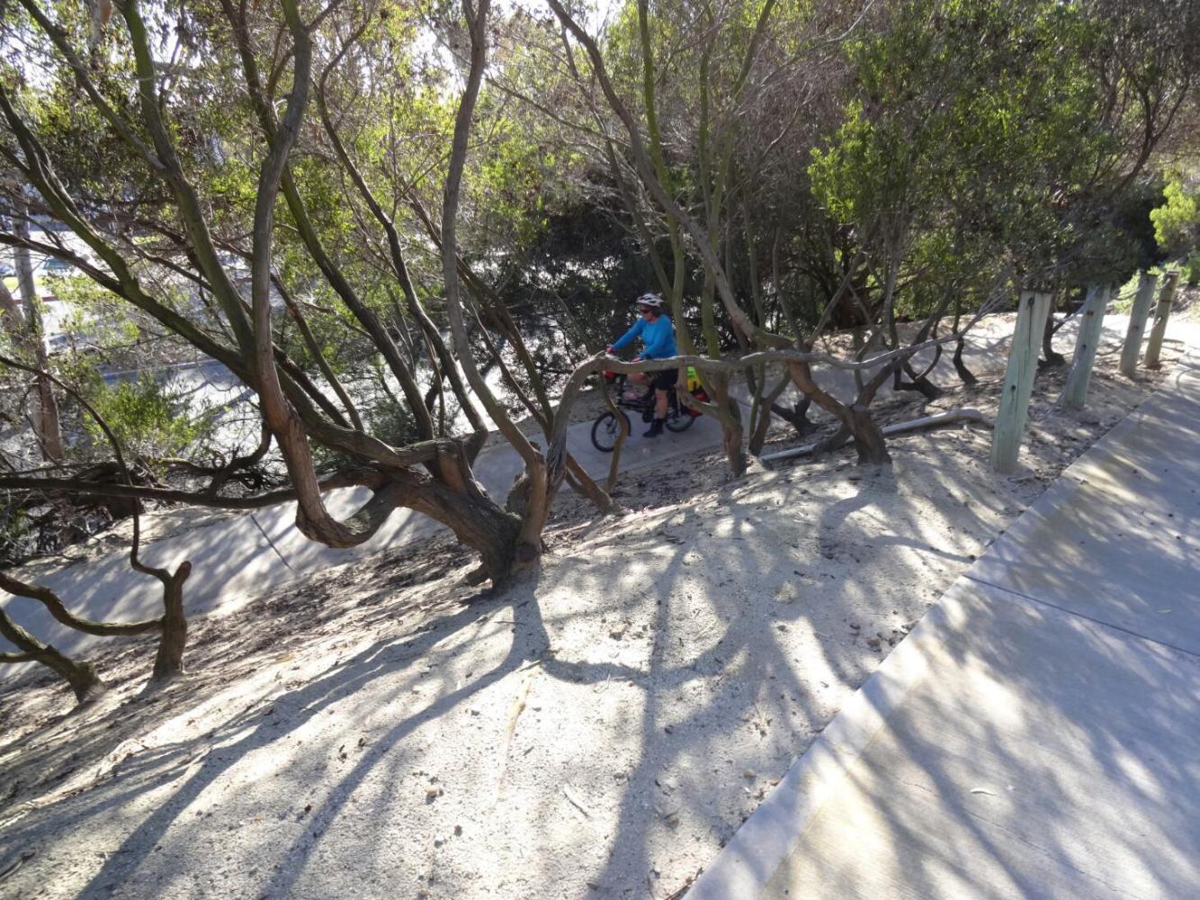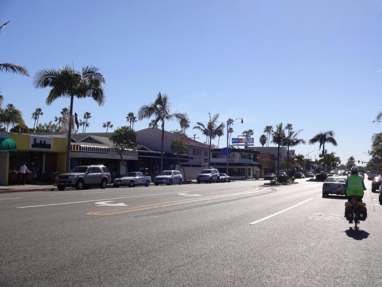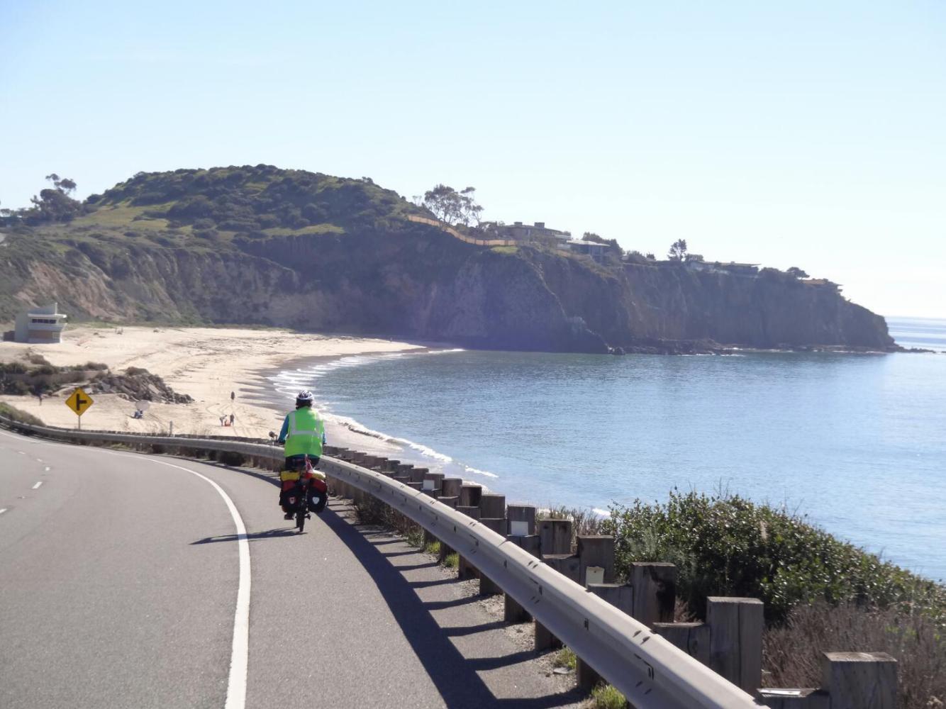 A half block away, near the beach, we ate lunch. Little kids enjoyed a play gym on the sand.People asked about our trip. It was nice. But we went back on the road. There was heavy Porsche traffic on the two lanes each way, and parked cars along the side. No room for us! We tried cringing against the parked cars and we tried taking the lane. Either way the drivers tried to bully us off the road. When there was a gap in the parked cars we nipped in, stopped, and panted. Then out again, waving our arms to signal left turn type behaviour, or waving our fingers at drivers who almost hit us.