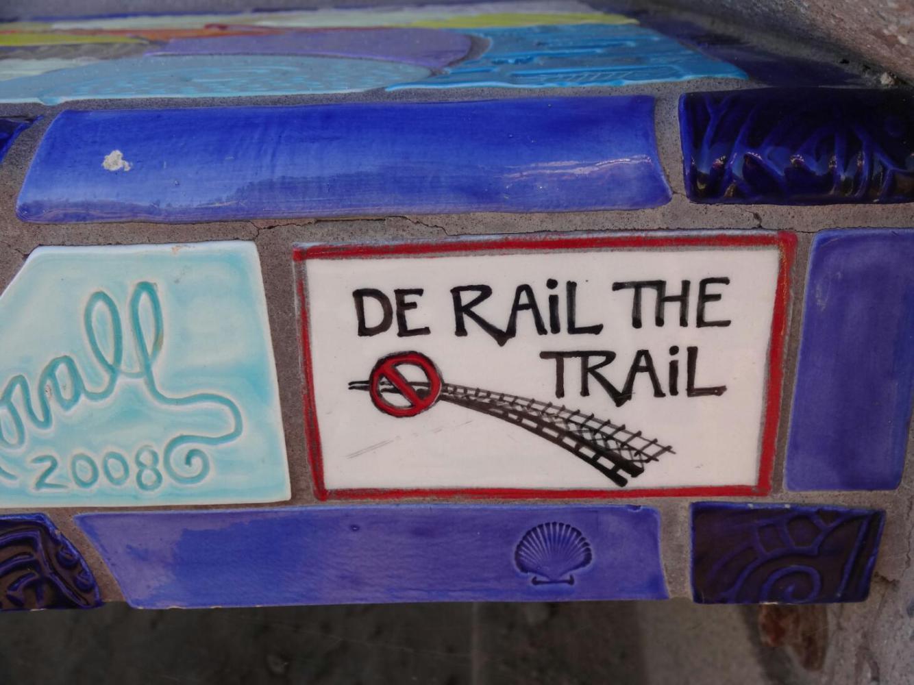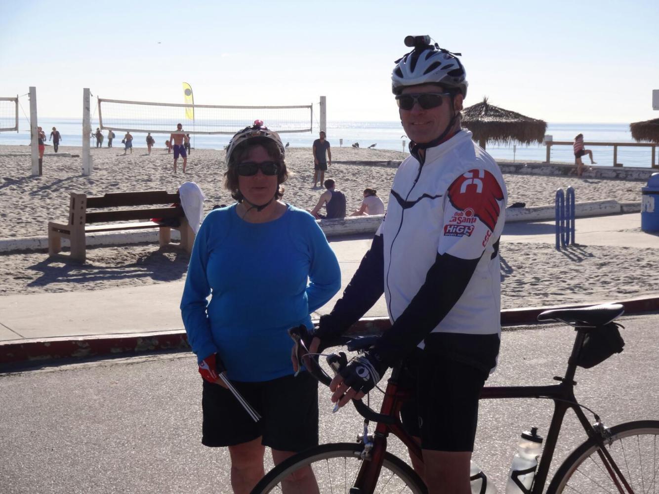 So this morning in San Clemente we set off with the ACA route, but soon said "Hey, why can't we follow the beach trail?" So we hung a right and headed for the beach. The first thing we came to was steps, descending to where we saw a path by the train tracks. I carried the bikes down, and off we went. The hard packed sand was fun and we pretended we were at Joni's place in Belize. This lasted only a short time, though. Clearly, someone had thought about it, since we came to a memorial bench for a former mayor who had founded the de Rail the Trail movement. But for now, we found ourselves climbing back out of the beach, back to the darn ACA route.