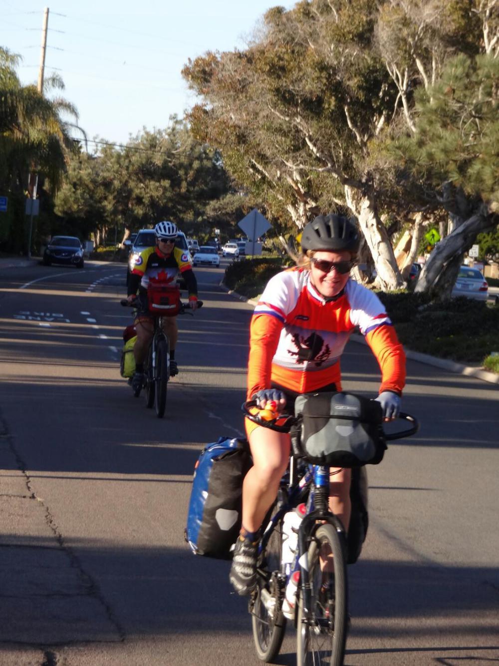 In the category of people currently on tour were Nat and Mick. Nat is Canadian and Mick from Netherlands. Here for the first time was someone with a Canadian flag out back, just like ours. Moreover, Nat had a spiffy maple leaf jersey. We were interested to look at other equipment choices, that included a Roloff hub, belt drive, disc brakes, Bob Ibex trailer, and iPad mini. Nat and Mick started from San Francisco, will turn left at San Diego and head for Florida. From there they will hop to Morocco, I think they said! Check out their blog at the address in the photo.