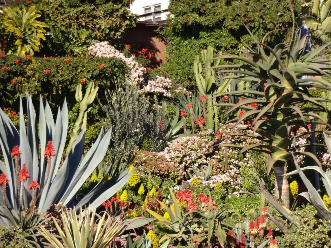 More and more we have been running in to either cyclists who offer us guidance or directions, people who have done distance cycling and want to talk about our trip and theirs, or even people currently on a tour. So for example, beyond Oceanside we ran in to Richard, who was cycling south on a day ride. Richard was interested in talking cycling, and rode along with us. He was willing to go at our snail like speed just to talk, since he flatteringly said he found the conversation interesting. Richard took us on an alternate route that he likes. One side benefit was that we ran into a really nice, and very extensive cactus garden by somebody's house.