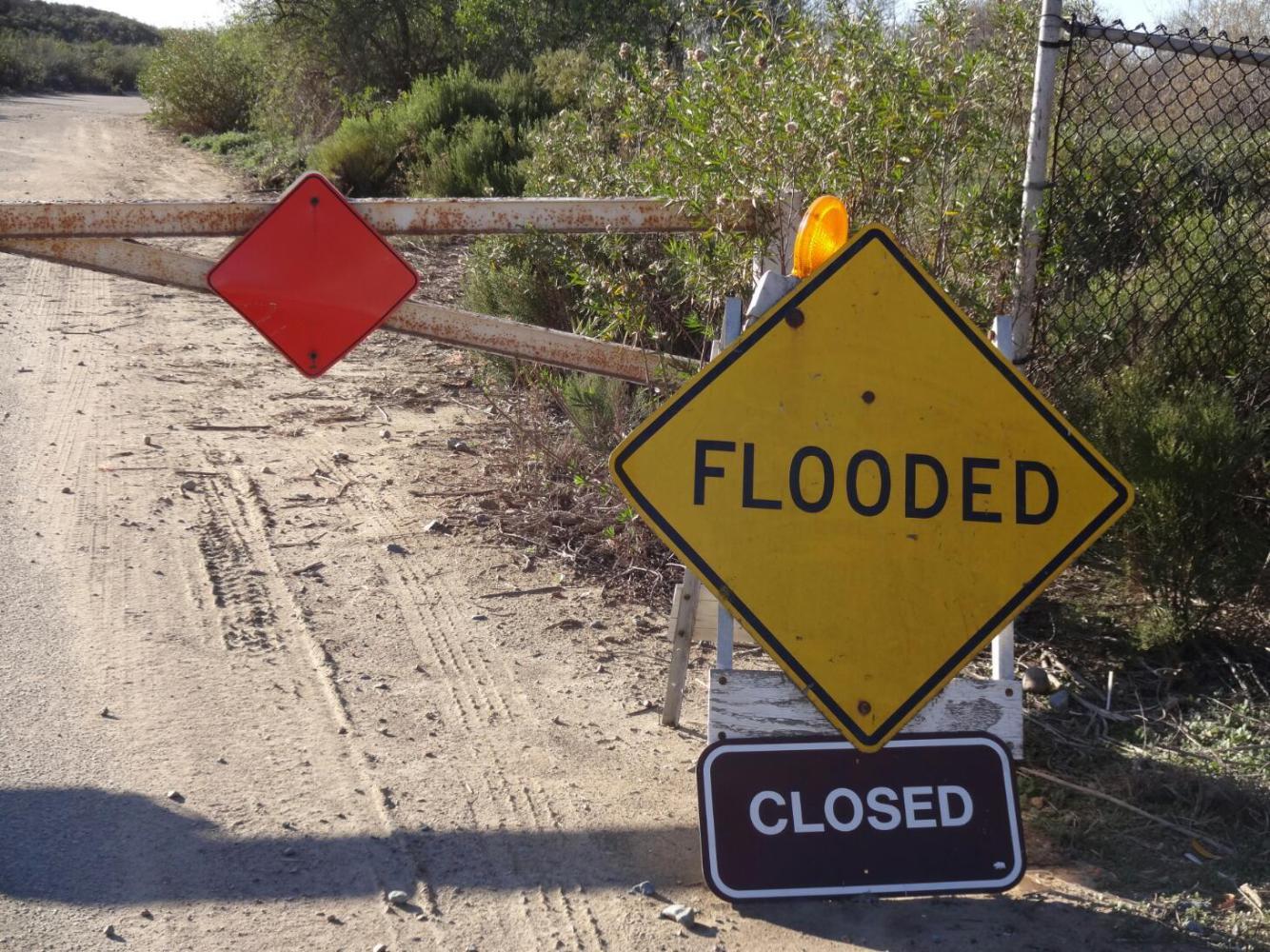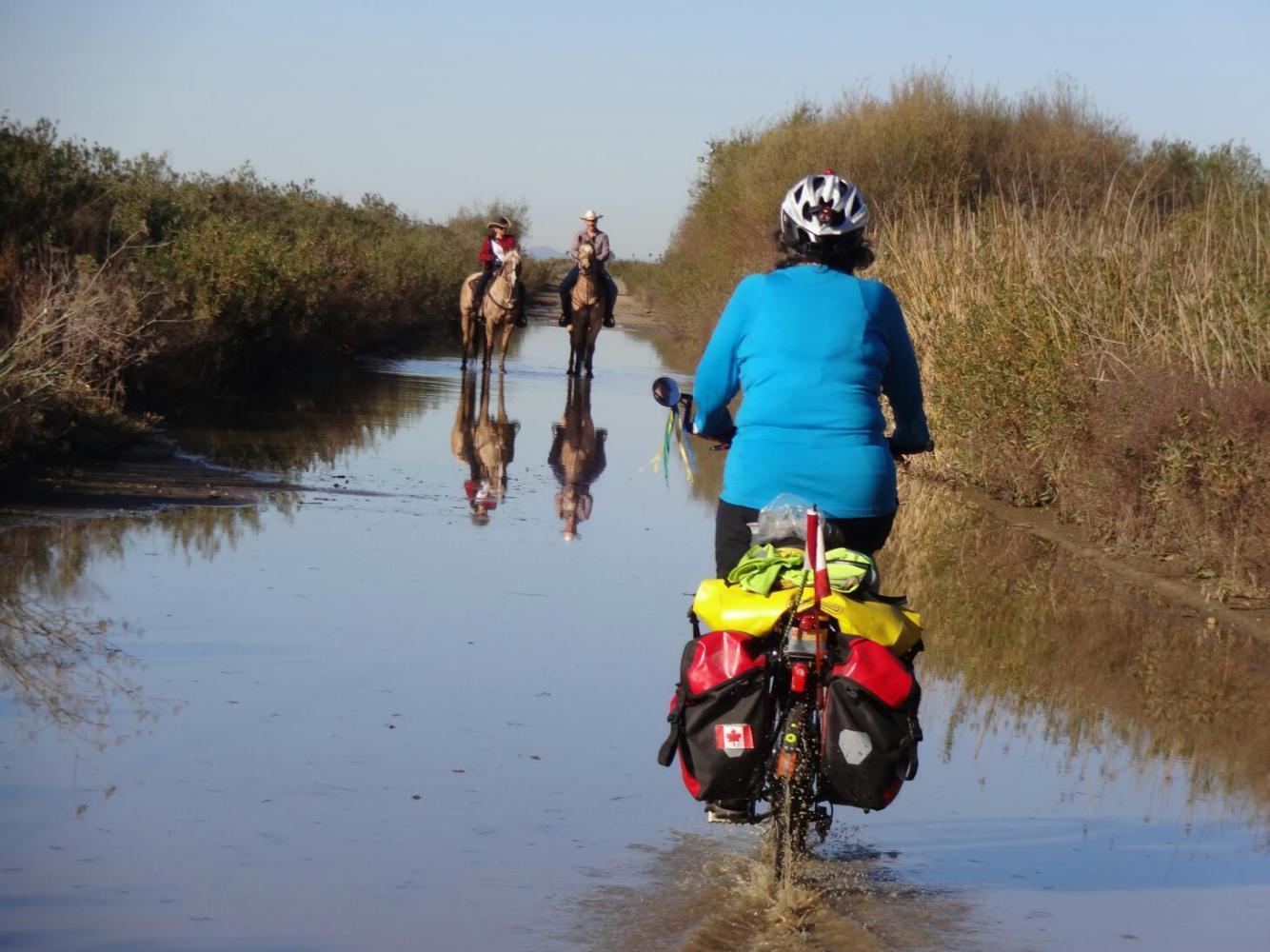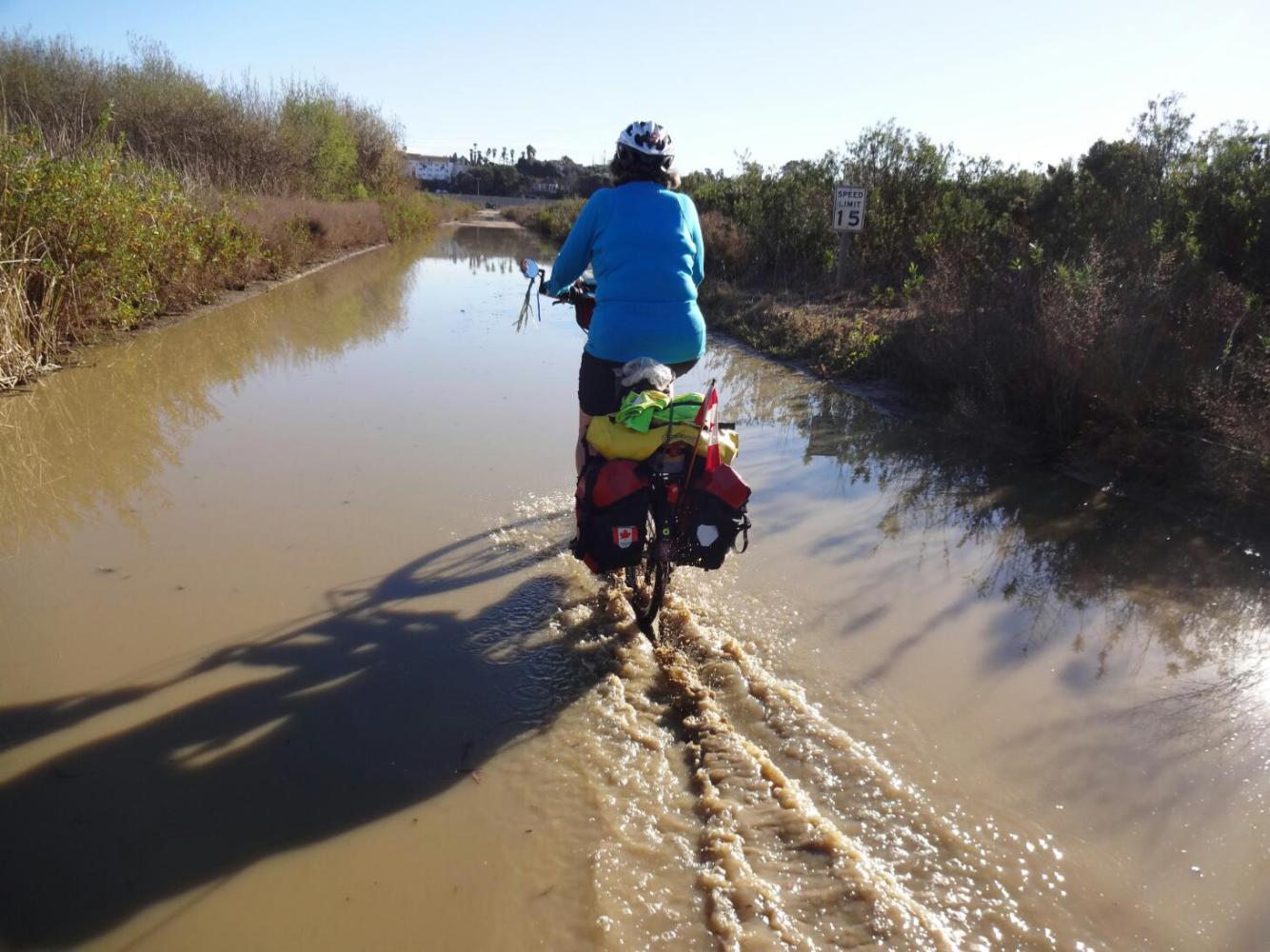 Eventually Matt left us to make our lonely, final push to the border. Unlike even the approach to the Canadian border in Saskachewan, there was no fanfare, no giant warning signs. In fact, there was nothing. Nothing but a giant, inpenetrable fence. With a fence like that, you don't need words. Actually, our first hint that we were getting near was in fact a sign, for Border Field State Park. One other sign, we ignored at first: " Road Closed - Flooded". After a km or two, though, we found this impossible to ignore. for 300 feet the road was replaced by a lake.