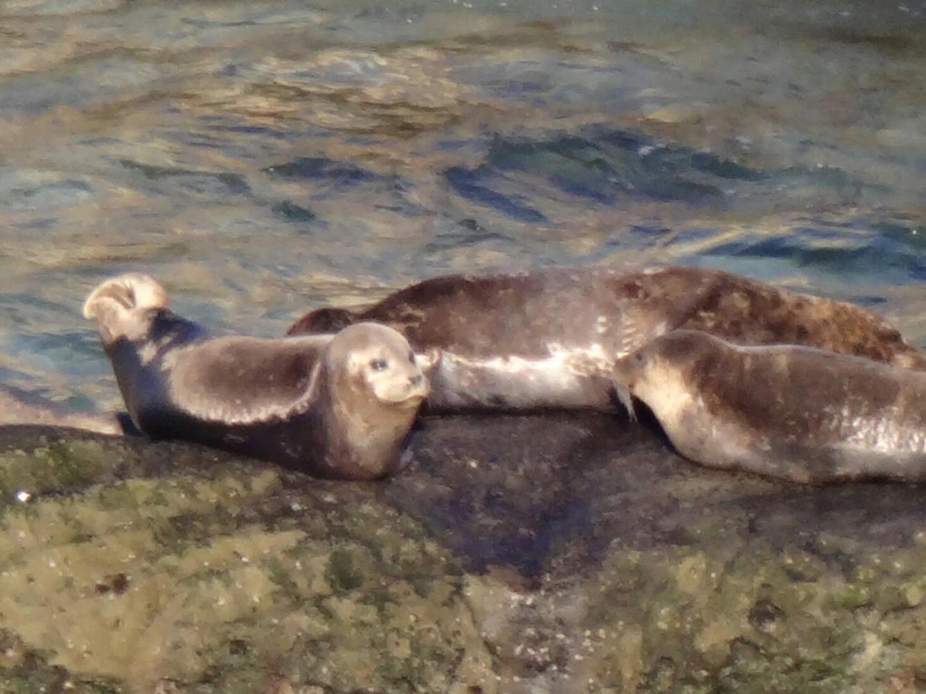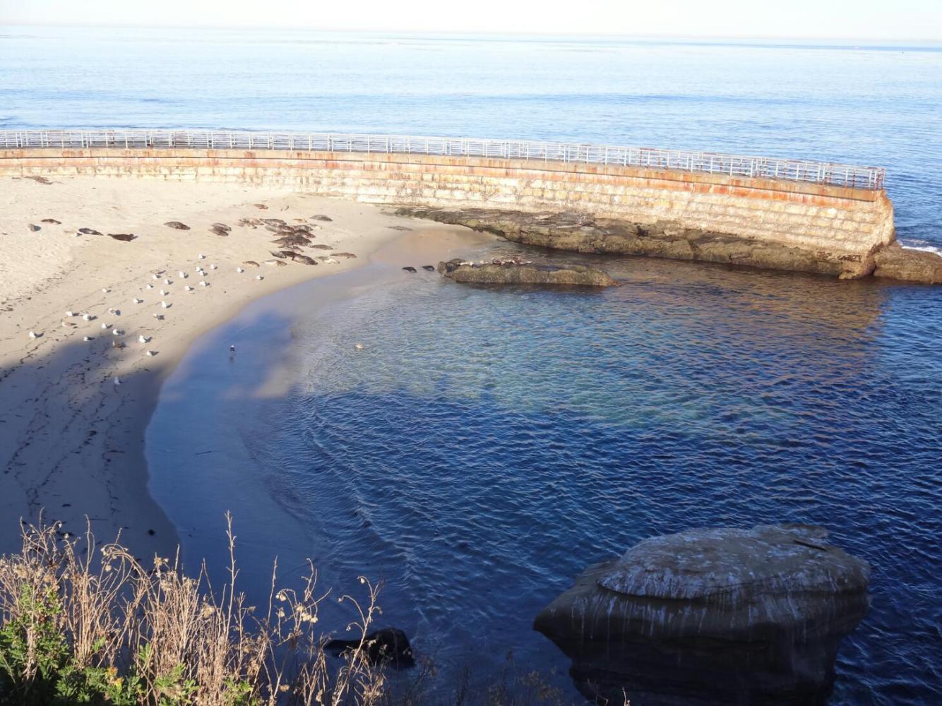We said a fond goodbye to Maureen , the manager at the motel. In just a short time we had made a friend, and will look forward to seeing her again. She had described some of the nice aspects of the La Jolla "village", but we felt a need to press on towards that Mexican fence. So we descended through just a bit of the town, and set out along the beach. Down there was a little cove, described as the Children's Pool. Standing around were a number of poster boards describing a dispute over the maintenance and use of this little area. We could not really understand the situation, given how the boards were written, but we think the cove was donated for children, was not maintained, and then was taken over by harbor seals. The seals, anyway, were the main attraction for us. They were sleeping on the beach and playing in the shallow water. Beccause of the dispute, some signs explained how to swim in the cove and coexist with the seals. That sounded like fun (but it was still too cold to go in.)
