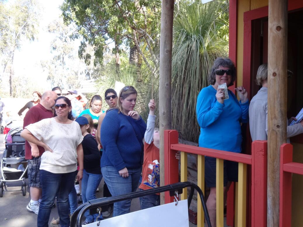 We got back to the giraffe area at 12:15 and found a long line, and we were not near the front. So Dodie gave me the ticket, and I joined the line in the sun, while she retired to the shade near the actual giraffe area. After a while a lady came up to me and said that Dodie had spied her little daughter, Sophia, terribly disappointed because tickets to feed the giraffes were long ago sold out. Dodie suggested Sophia piggyback on our ticket and one of our three giraffe cookies.
