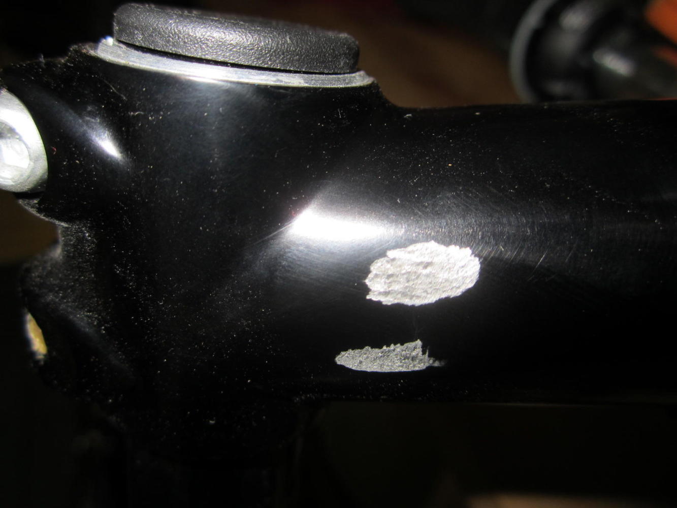 Here is the stem of Dodie's bike, ground to bare metal on the bike rack.