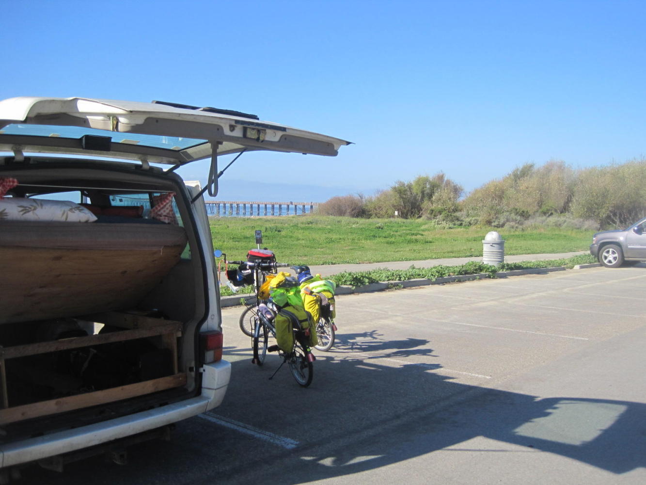 We put our van right by the ocean, at Rincon beach - near Ventura, in the night. There were scads of giant RVs parked along here, so we just joined the party. At daybreak we moved to a beach at Ventura (Buenaventura Park) and headed back North on the bikes.