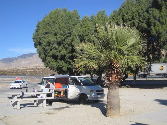 Our camp spot at a rest stop on I-10. With the van it's OK, but we have never tried staying at these with a tent. There are no anti-tentwarning signs at the I-10 stops, but we have often seen them on other Interstates.