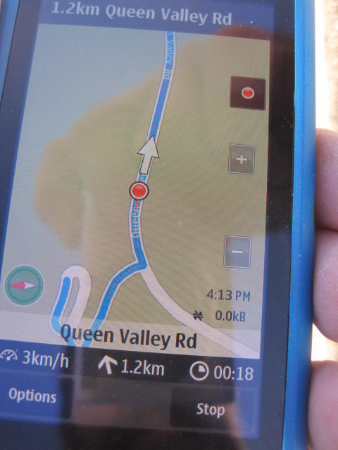 "Just for fun" I got the GPS function in the Nokia N8 to note our starting position as we headed into the desert on a very short hike. Dodie was not impressed. She said "It's stupid to drag out a piece of technology while trying to enjoy a quiet back to nature experience". Fair enough, but after we had walked quite a while after seeing the last trail sign, what the GPS had to say became of more interest! To be fair, while I was trying to decipher what the thing was telling me, Dodie found a road. Good news, since three young women had decided to follow us, so we were now all lost. Seeing a road, the GPS now gave very clear walking directions back to our van. We were only a couple of miles off base. Score: Dodie 1 Nokia 1