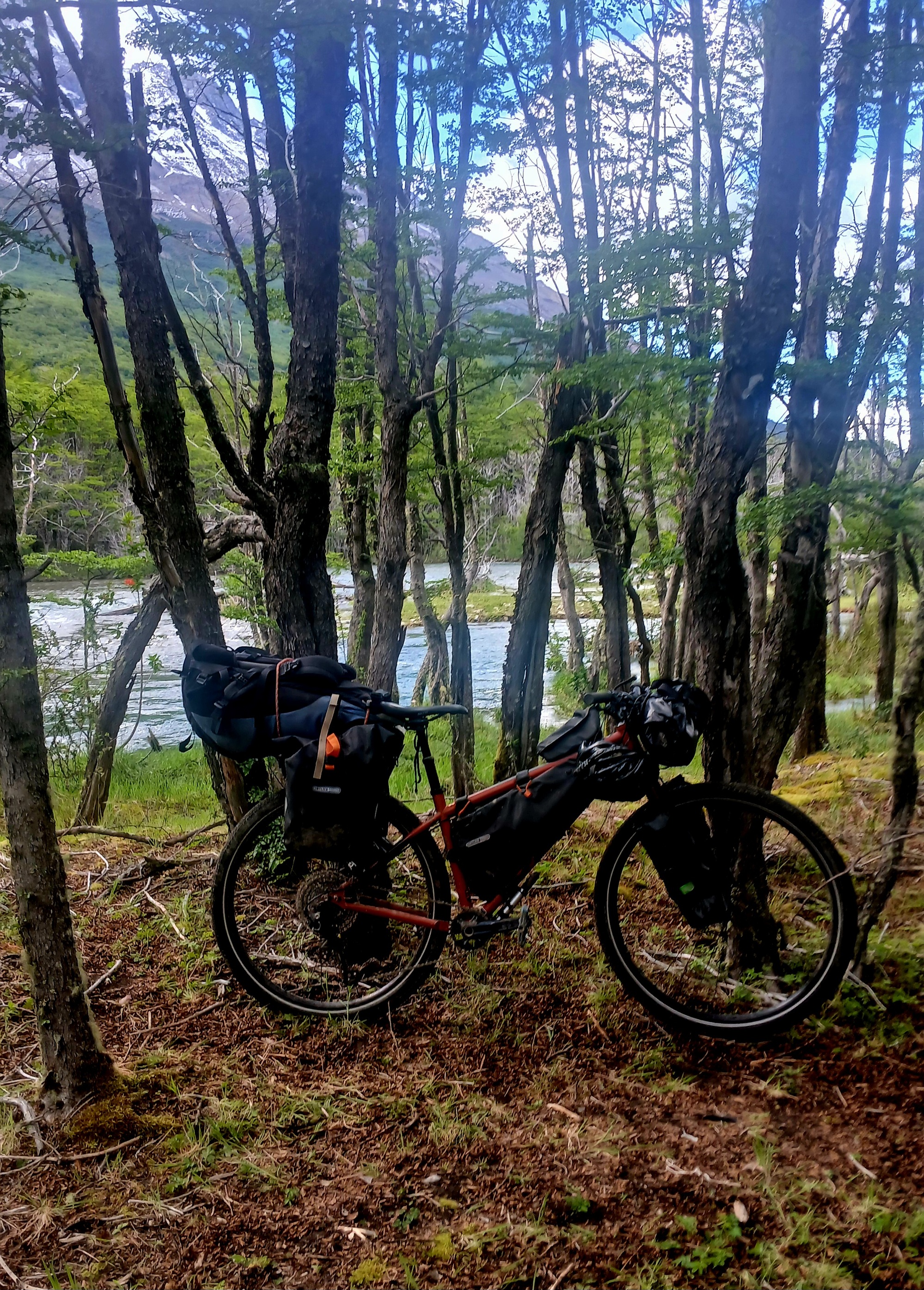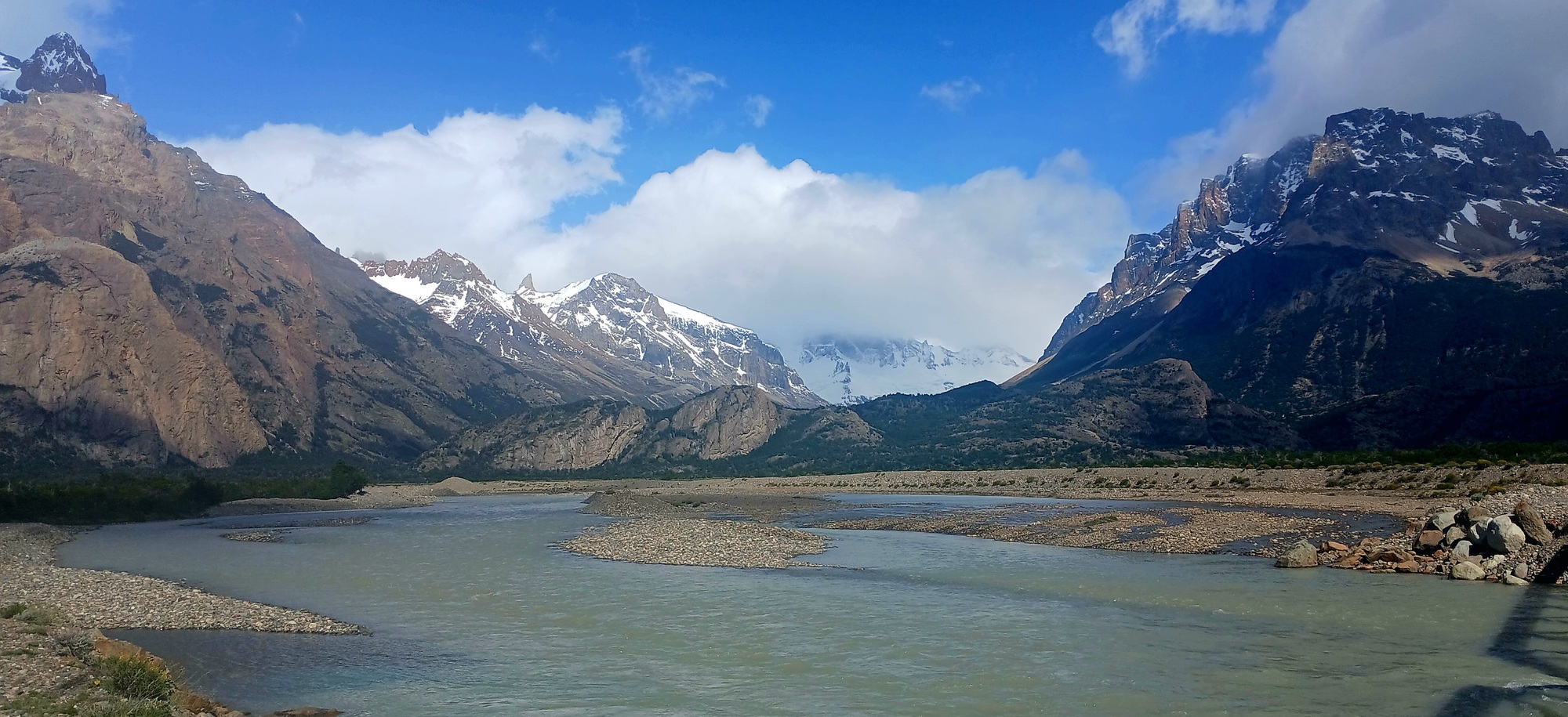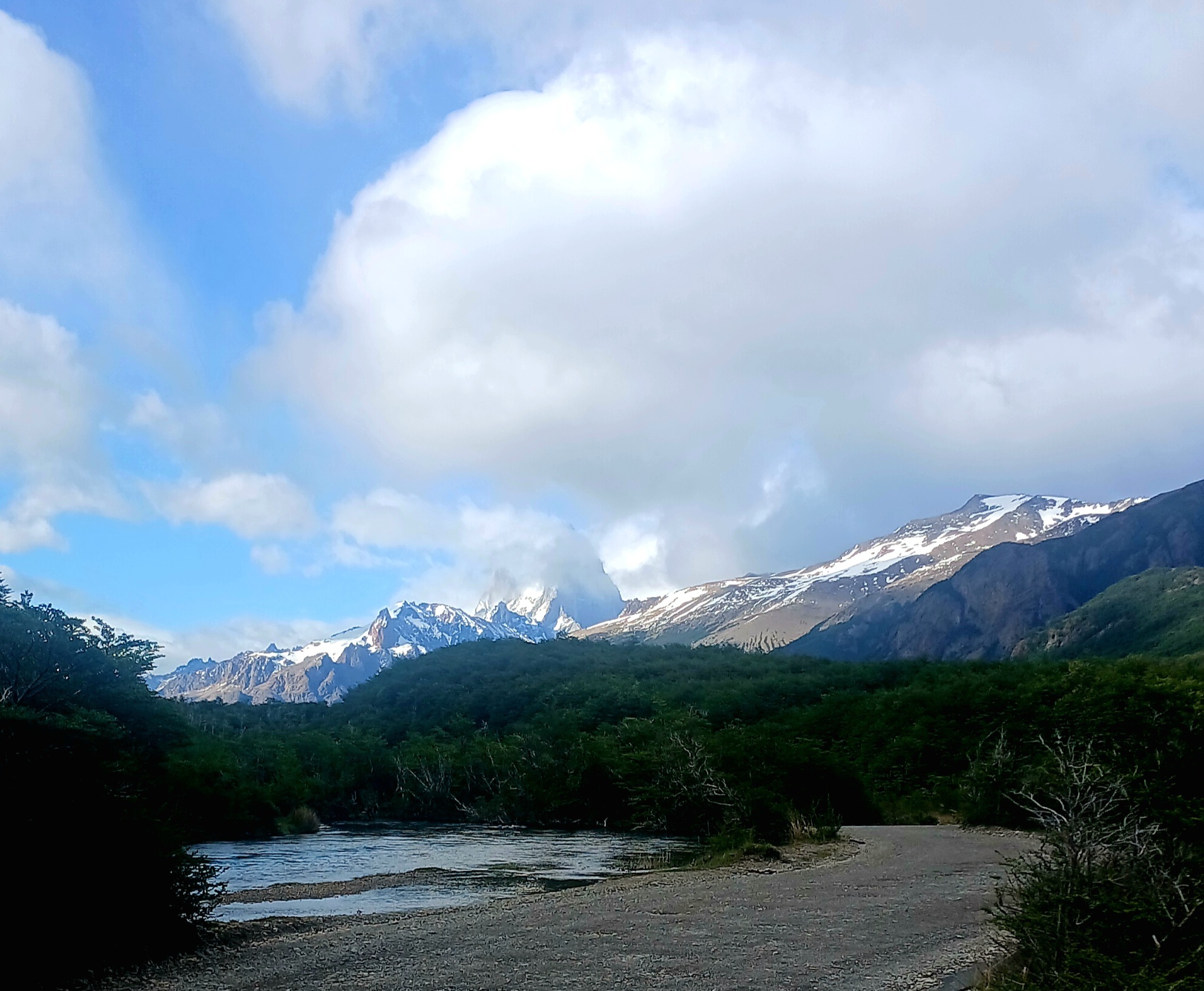 I set off shortly after 08. The gravel road twists and turns following the winding coarse of the big river I'd camped in the trees by. Ahead, fast moving plumes of cloud swirl up revealing Mount Fitzroy, like a colume of white smoke rising over the peak, then stopping.