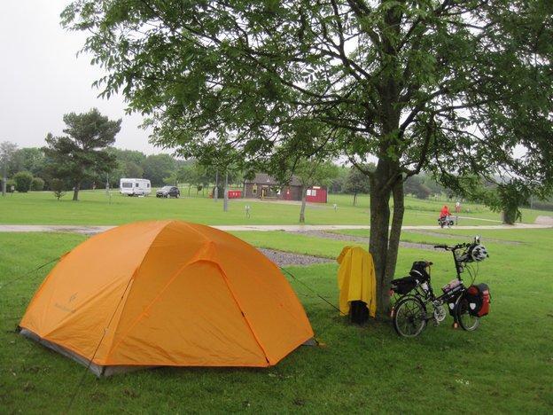 We found the camping that had been indicated on our map. It was the Hastings Country Park, a large and all but deserted site. There are flush toilets, and lots of space, so despite the rain we are happy.