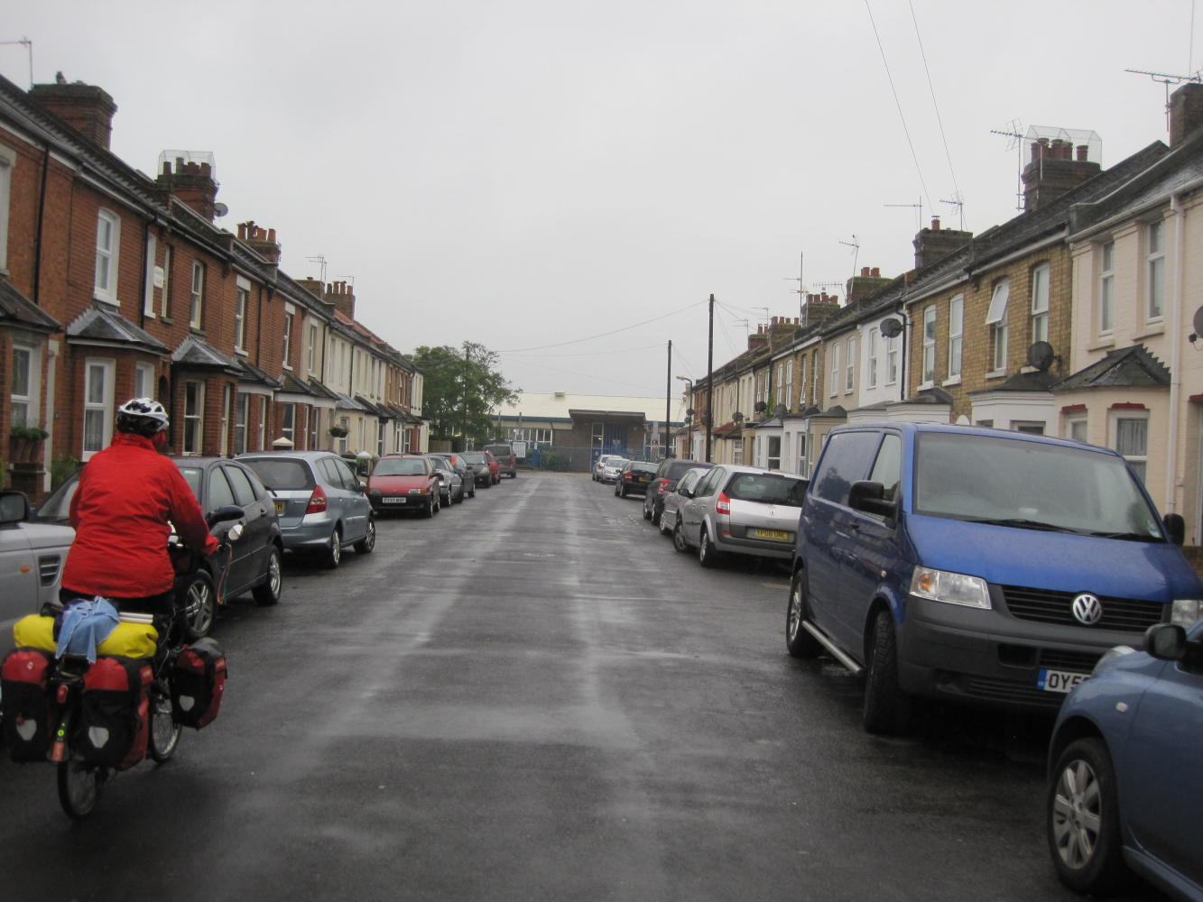 We woke up with light rain and again took the tent down from the inside out. It was too wet to cook comfortably, so we set off without tea. We had our last little bit of cycling in what we now recognize as the pleasant Romney Marsh.