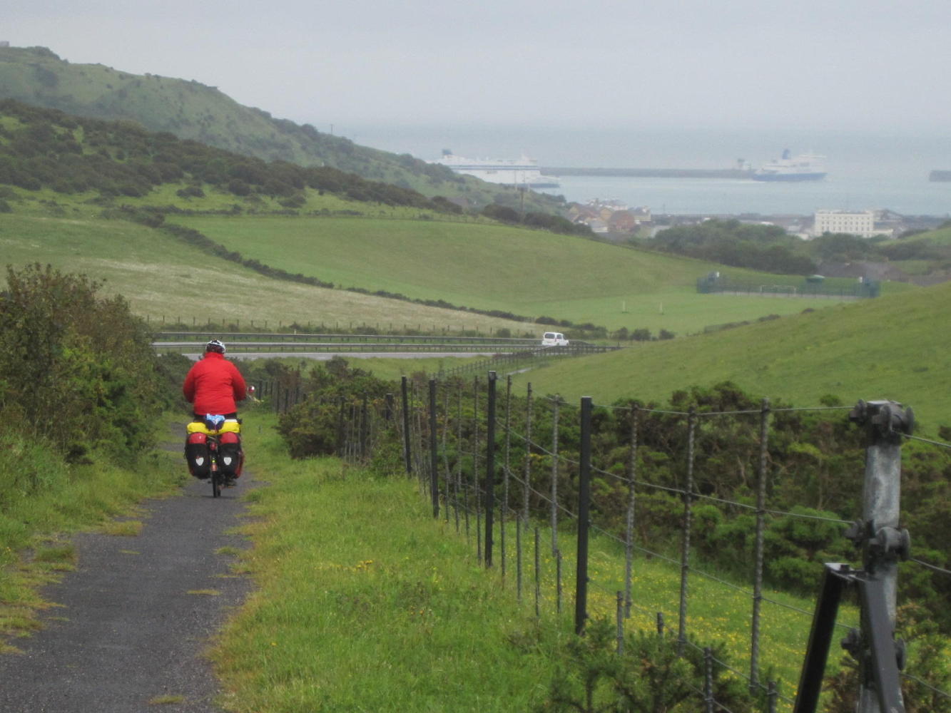 We got to see the port in Folkstone because NCN 2 again took a turn we did not see. It was worth it, but we had to backtrack. We asked a man who at a distance looked like a cycle tourist, but turned out to be a Royal Mail man on a red bike with red panniers.