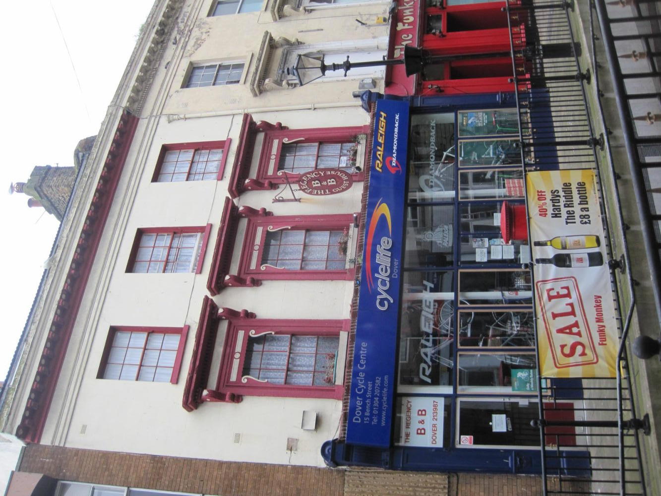 In our first few minutes of noodling around downtown, looking for a place to stay, a post office for our first mailback, and the tourist information, Dodie spotted a bike shop. Maybe they would have some cycle maps? We went over for a look, and met Dennis, who runs the shop. No maps, but now Dodie also spotted a B&B, just next door. The door had a price list: 35 single, 50 double, with breakfast. We asked Dennis if the place was OK. He said, "well yes. my Dad owns it". So, we now live above a bike shop! And guess where we stashed our bikes!